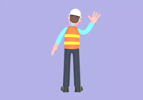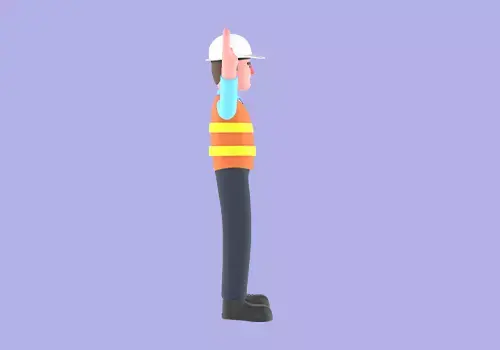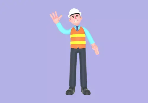 This stylized 3D male architect character features a cartoon-style professional standing upright with his right hand raised forward in a waving or “stop” gesture, expressing anger or dissatisfaction. Perfect for construction site scenes, safety instructions, or animation projects that require assertive or disciplinary expressions.