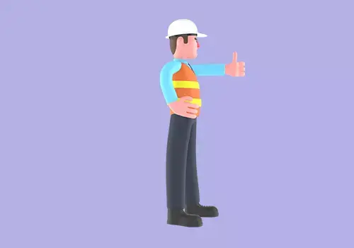 This stylized 3D male architect character features a cartoon-style professional standing upright while giving a thumbs-up or “OK” gesture with his right hand, displaying a slightly tense or serious expression. Ideal for construction-themed animations, presentations, or workplace scenes that highlight confidence, approval, or leadership.