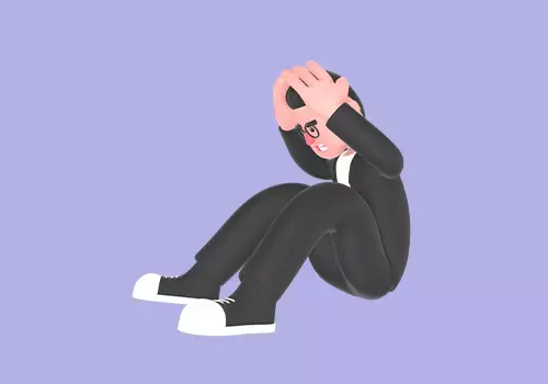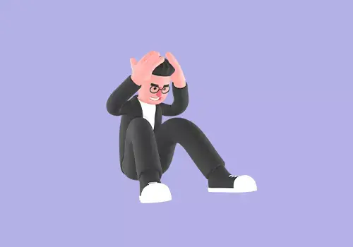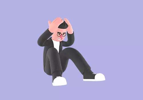 This stylized 3D male editor character depicts a cartoon man sitting curled up on the floor while holding his head with both hands. His facial expression shows extreme stress, frustration, and emotional pressure, representing burnout, anxiety, or overwhelming workload situations.