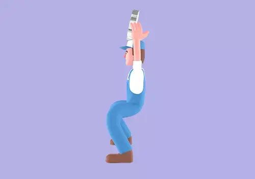 This stylized 3D male mechanic character features a cheerful cartoon man squatting while holding a car tire with both hands placed on his knees, showing an energetic and joyful expression. Designed for use in automotive games, garage scenes, animations, or creative 3D projects.