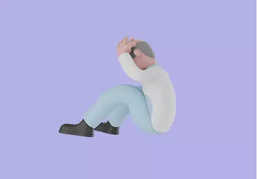 This stylized 3D male scientist character shows a cartoon scientist sitting on the floor while holding his head with both hands, expressing panic and extreme stress. The pose clearly represents pressure, failure, confusion, or overwhelming situations in a laboratory or research context.