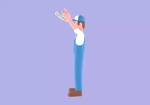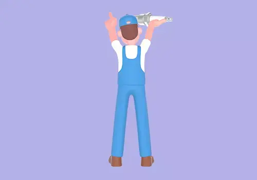 This stylized 3D mechanic character features a cartoon male technician standing with both hands raised holding a large spark plug in one hand while pointing upward with the other. The character shows an angry, energetic expression as if protesting or making a bold statement. Ideal for automotive-themed animations, workshop branding, mechanic illustrations, UI assets, and game characters.