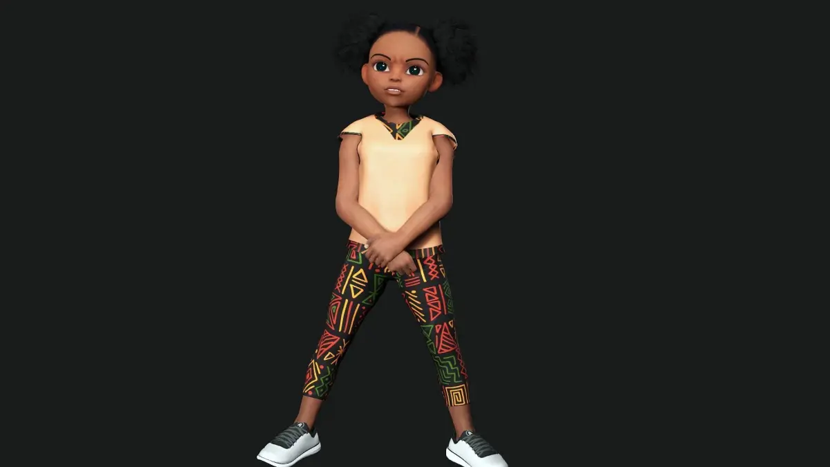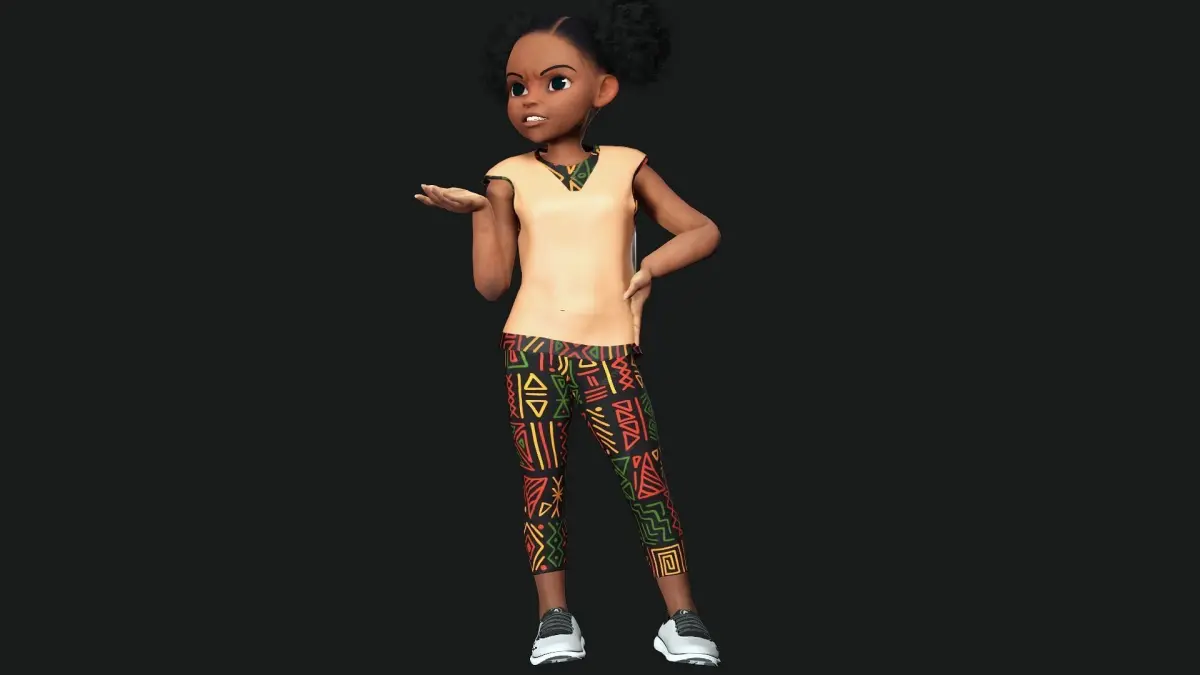 A model of a cute stylized black african girl character modeled, textured , rigged and rendered in blender 3.3.