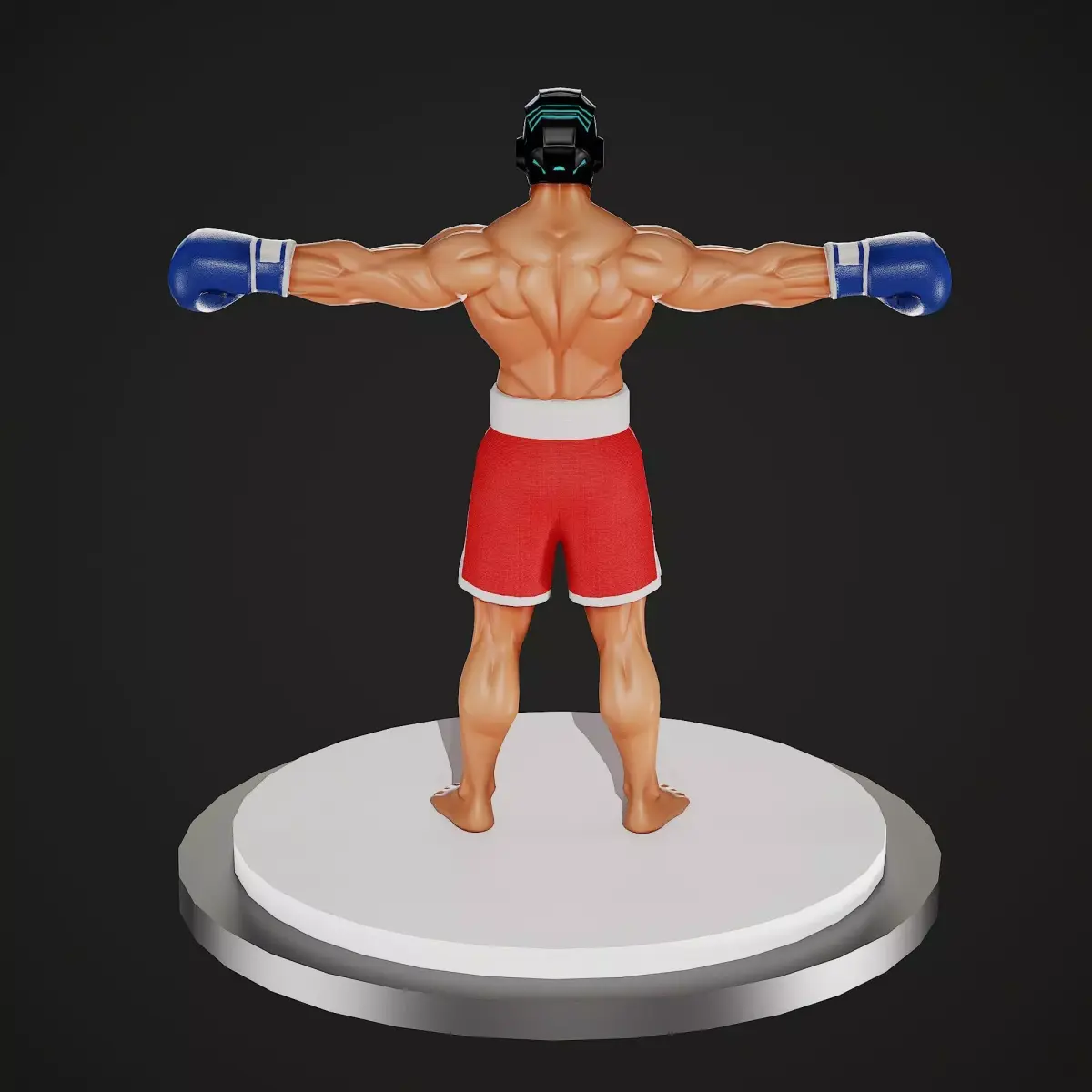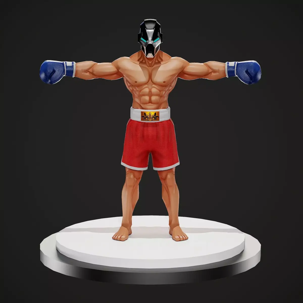 This is a stylized, low-poly, game-ready boxer character designed for real-time applications. The model features a heroic athletic build with exaggerated musculature, optimized for clear silhouette readability in gameplay. A futuristic cyber mask replaces the traditional head, adding a sci-fi twist to a classic boxing archetype and making the character suitable for arcade fighters, mobile games, or stylized action titles.