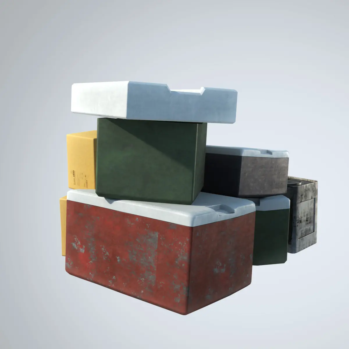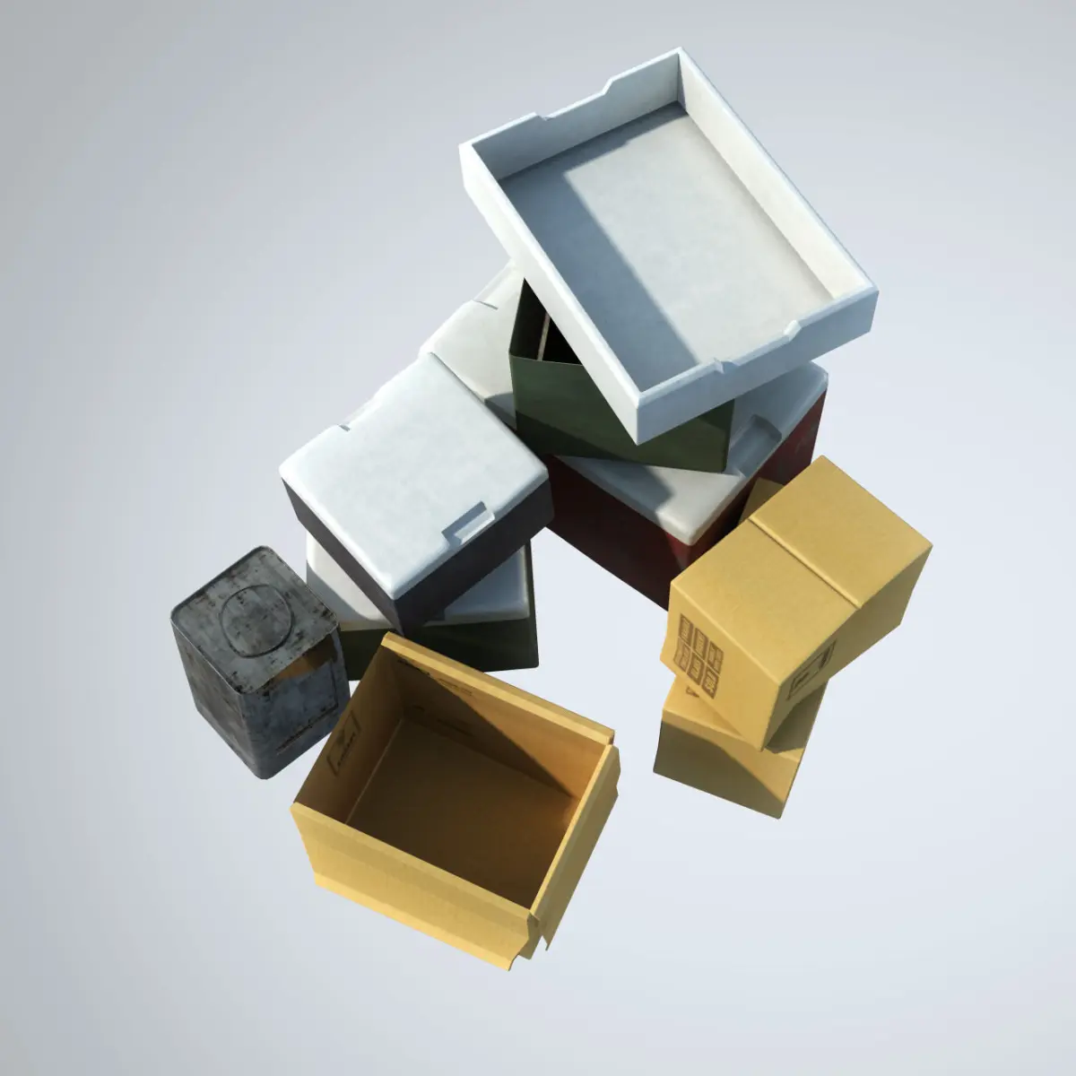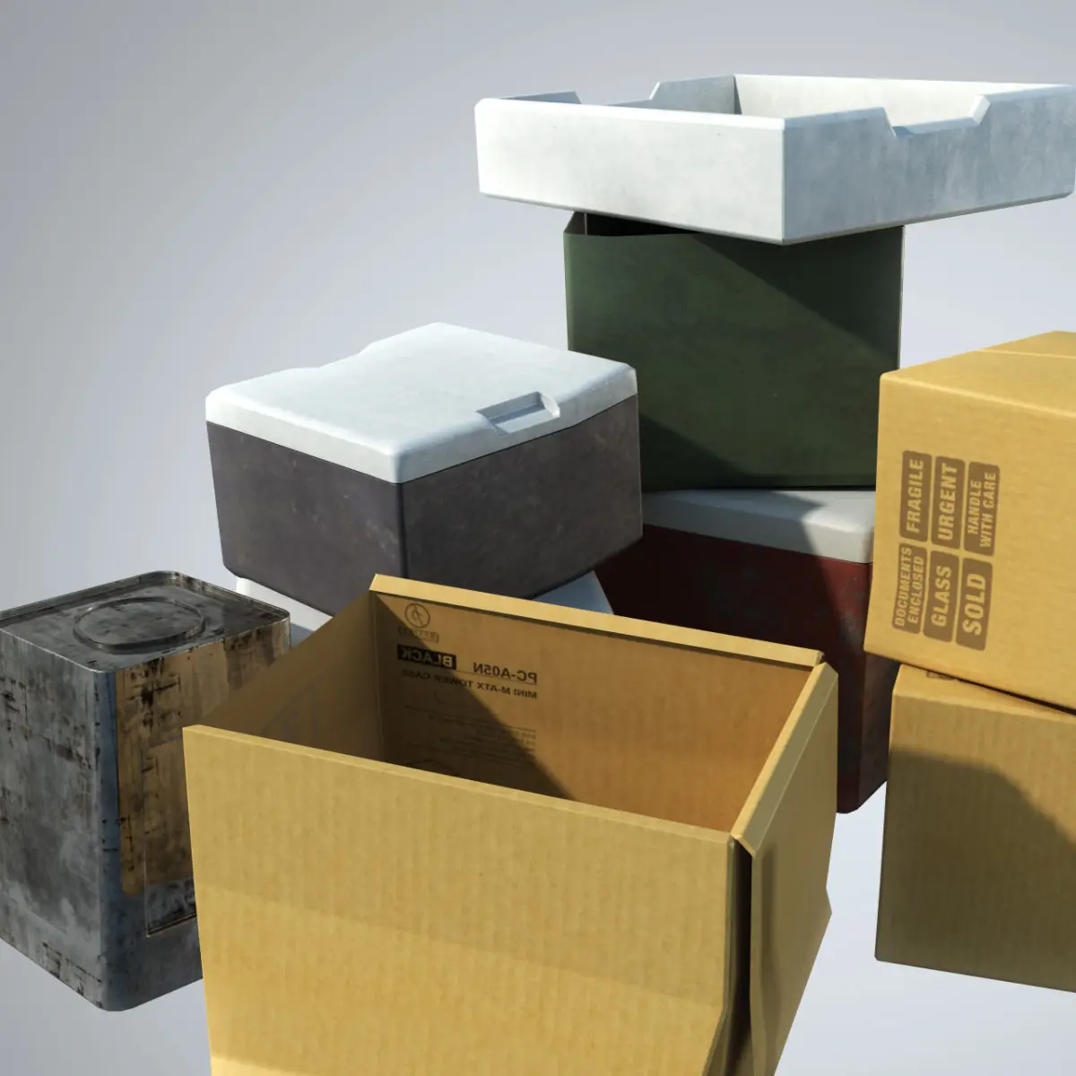 Stylized boxes Model.It can be customize into different combination of set designs with these particular base meshes.3 types of boxes,paper boxes, metal box & plastic boxes.