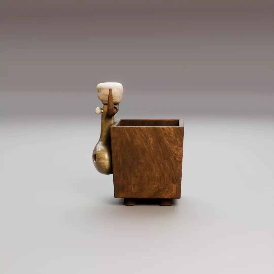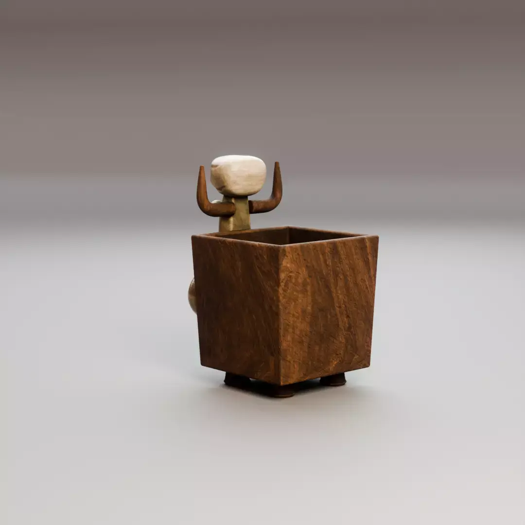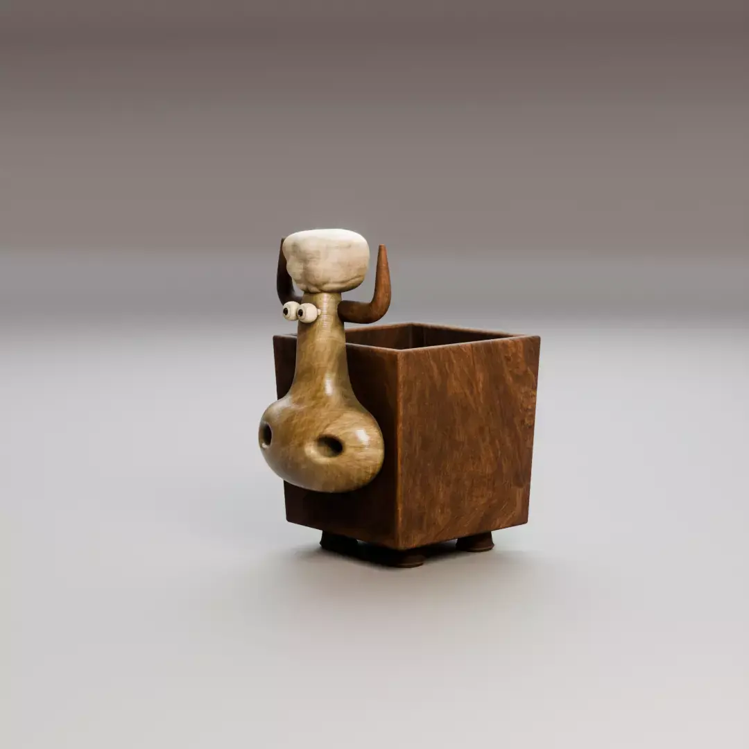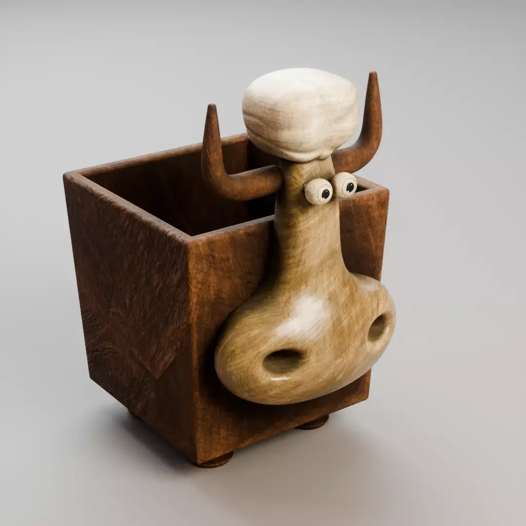 This is a stylized bull-shaped pencil holder designed as a functional and decorative desk organizer. The model features a cartoon character head emerging from a wooden box container, making it ideal for playful interiors, children’s rooms, creative workspaces, and stylized scenes.