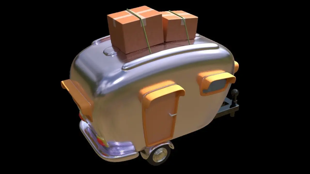 Model contains 12 seperate parts. Body of the caravan, the hitch, tag text, door handle, 2 wheels, 2 fenders, 2 cardboard moving boxes, and 2 bungee straps. Empty interior.