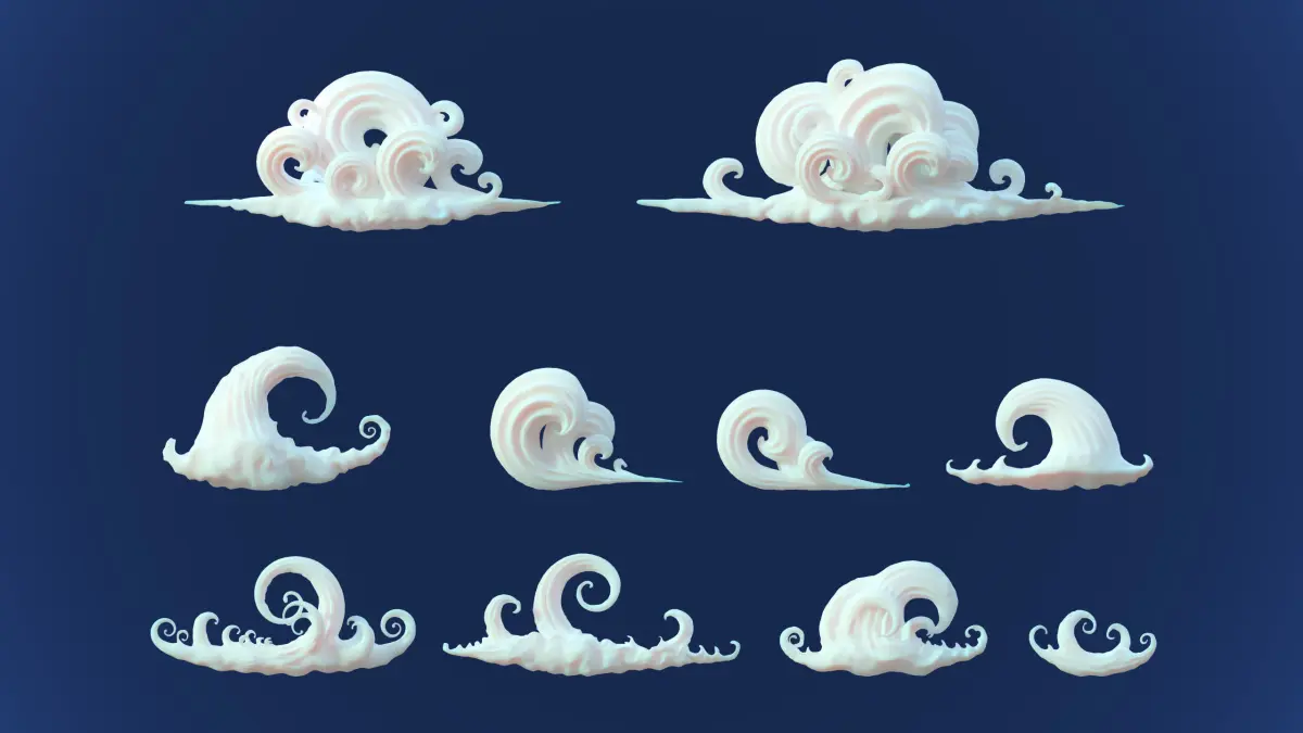 Curved, sculpted clouds with a magical and cartoon-like aesthetic.Clean geometry with optimized topology for rendering efficiency and game engine compatibility.