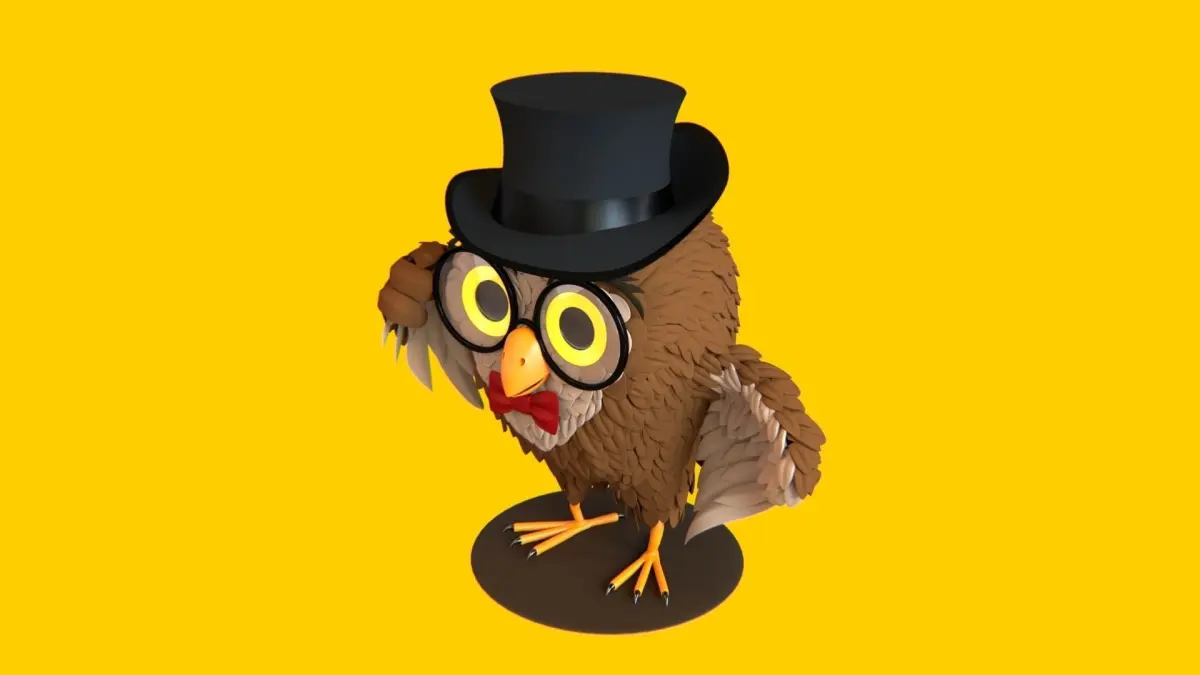 A high-quality stylized 3D model of a cartoon owl character, designed with attention to detail and optimized topology for animation, rendering, and 3D printing. This charming character features a full outfit, including a top hat, round glasses, and a bow tie, making it ideal for creative projects such as commercials, animated films, education, games, or collectibles.
