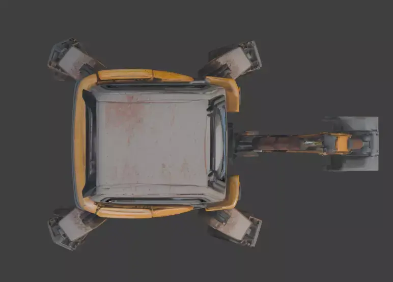 Realistic Industrial Weathering: Professional PBR textures include detailed rust patches, oxidized metal edges, and grime buildup on the hydraulic arm and chassis.