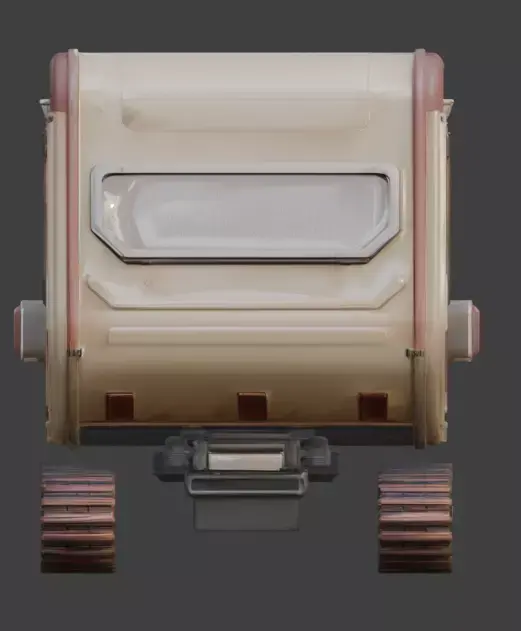 The Stylized Chibi Sci-Fi Modular Trailer is a charming and unique 3D model that blends utilitarian industrial design with a cute, cartoonish aesthetic. This boxy, beige trailer body sits atop a heavy-duty continuous track system, designed for traversing rugged or snowy alien landscapes. The model features rounded corners, soft red accents along the trim, and a weathered surface texture with realistic dirt and rust stains that suggest a history of exploration. With its compact chibi proportions, detailed door hardware, and large observation windows, this modular unit is a perfect asset for stylized strategy games, mobile RPGs, or whimsical sci-fi dioramas.