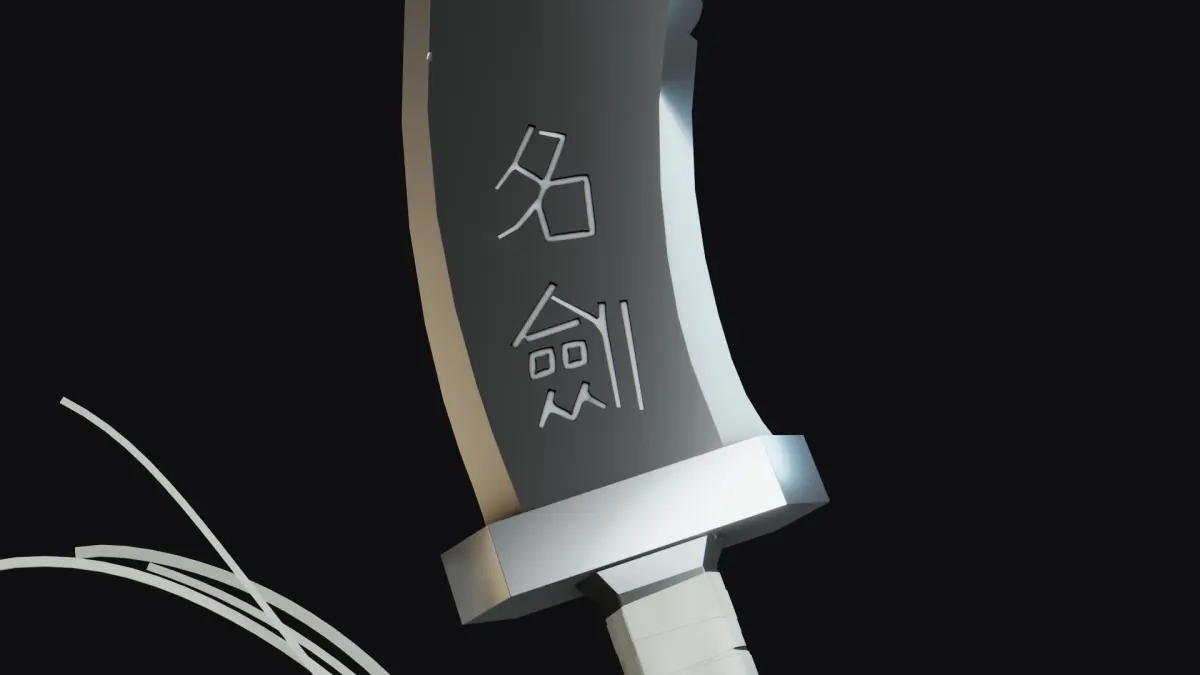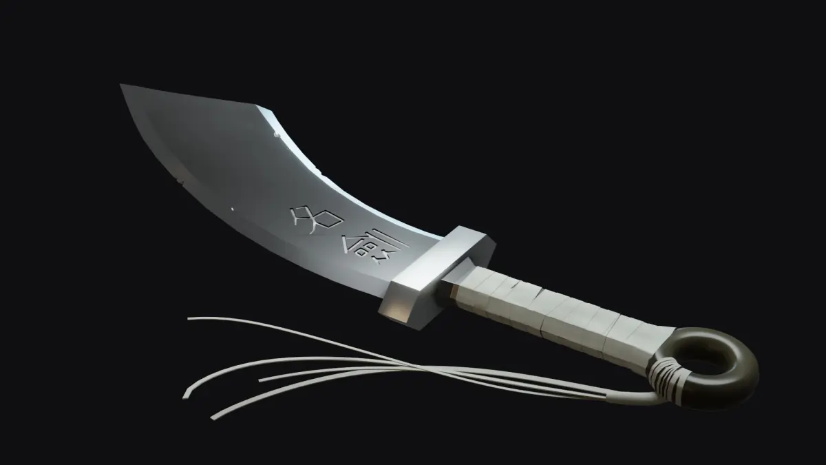 Curved Dao-style Blade: Signature broad curve with a sharp edge and engraved lettering.