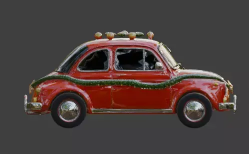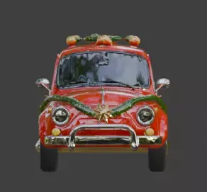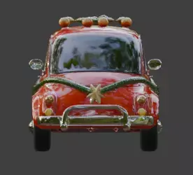 A festive high-resolution 3D cartoon-style car model featuring a vibrant red body and a classic rounded silhouette. Adorned with a dense green garland wrapped around its frame and roof, this asset is decorated with golden baubles and integrated holiday lights. With its smooth glossy materials and playful stylized geometry, this model is ideal for holiday-themed games, seasonal animations, or virtual festive environments. The asset features fully opaque black windows and is presented as a full-body model isolated on a clean white background.