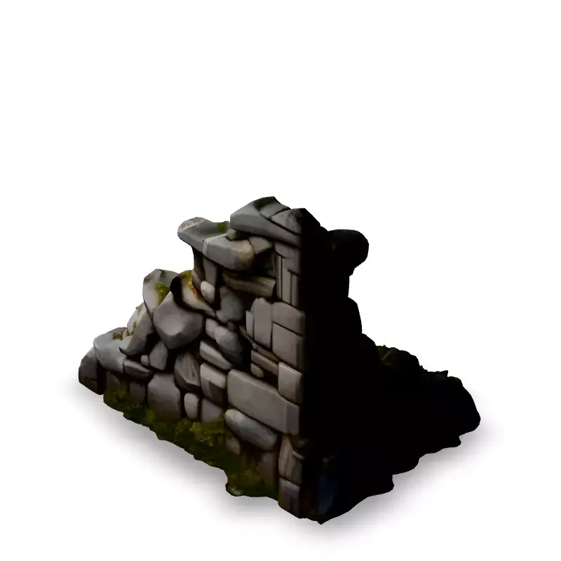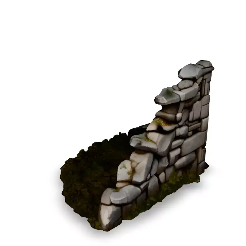 This stylized crumbling stone wall section is a versatile 3D model ideal for game environments, architectural visualization, and other creative projects. It features a realistically weathered appearance with moss and grass details, adding a touch of nature to your scenes. Suitable for both real-time applications like games and AR, as well as high-quality renders for architectural visualizations or animations. This model comes in multiple file formats including FBX, OBJ, GLB, and STL for easy integration with various software. Its optimized topology ensures efficient rendering while retaining high visual fidelity. PBR textures enhance the realism and offer customization options. Whether you're crafting a medieval fortress, a post-apocalyptic world, or a tranquil garden scene, this crumbling wall will bring character and depth to your project. It is game-ready and can easily be incorporated into your game engine. It can be used in games, virtual reality and other real-time applications.