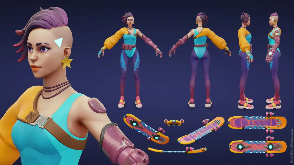 High-quality, stylized, 3D character model of a cyberpunk skater girl. This character can be quickly integrated into your game without worrying about the quality and technical issues.