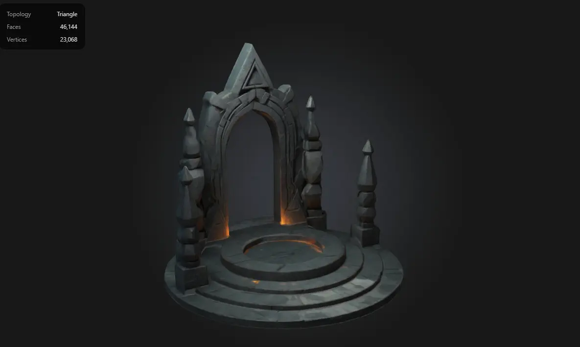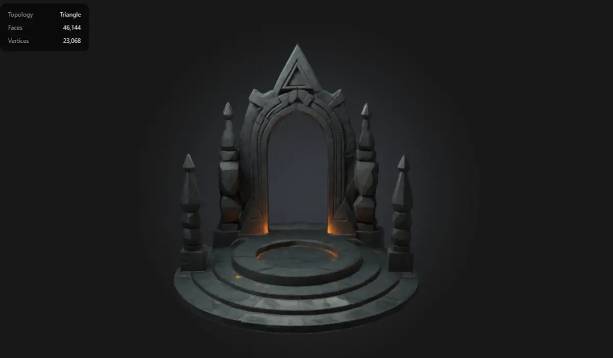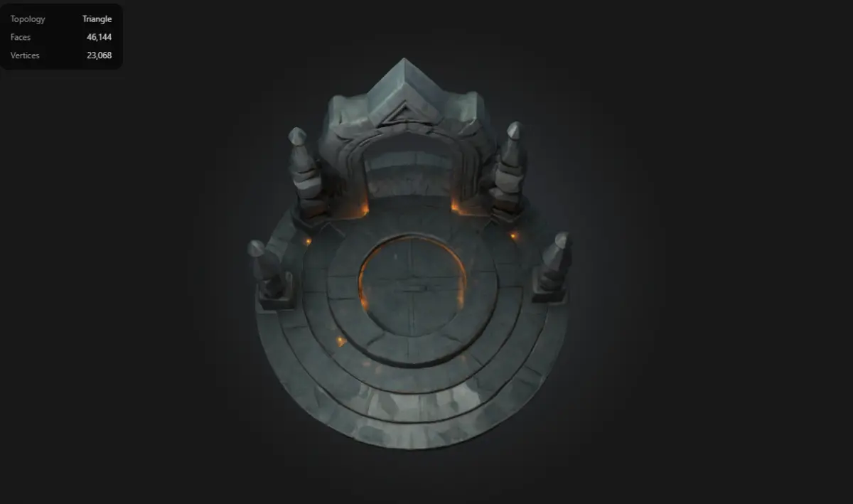 A stylized dark stone portal platform designed for magical rituals, ancient teleportation zones, or boss entrances. Featuring engraved rocky pillars, mystical circular steps, and subtle glowing lights, this asset fits perfectly in fantasy, dungeon, or dark-themed adventure games.