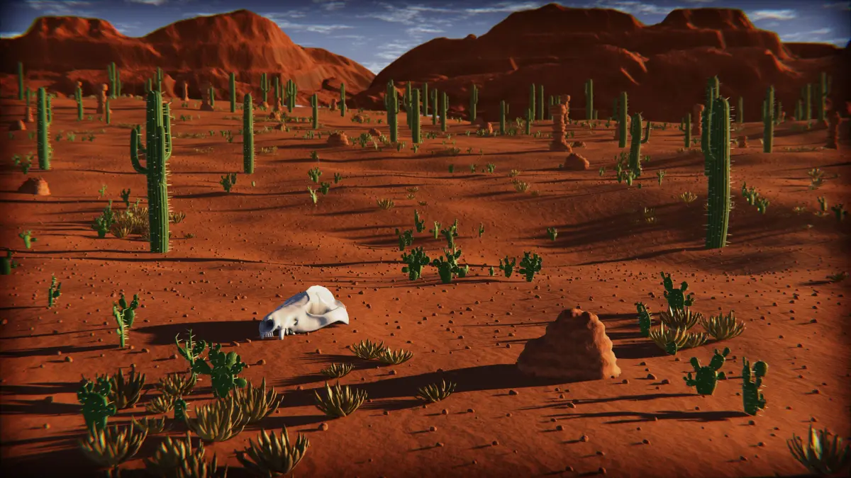 The desert objects are distributed on the ground using Geometry Nodes and weight painting.