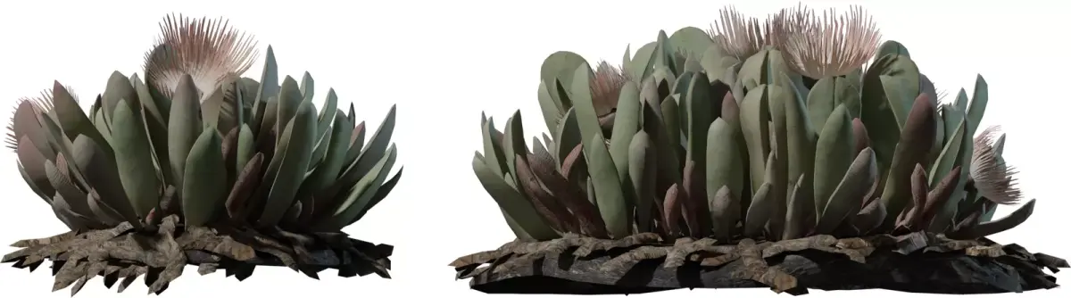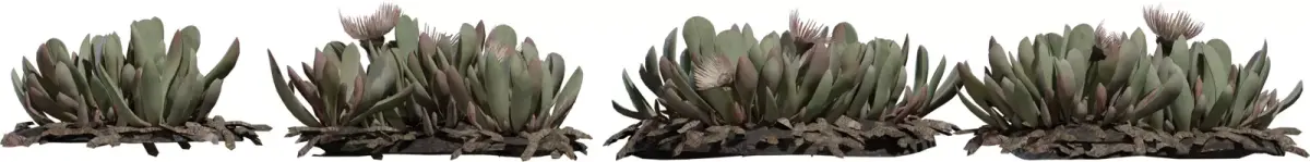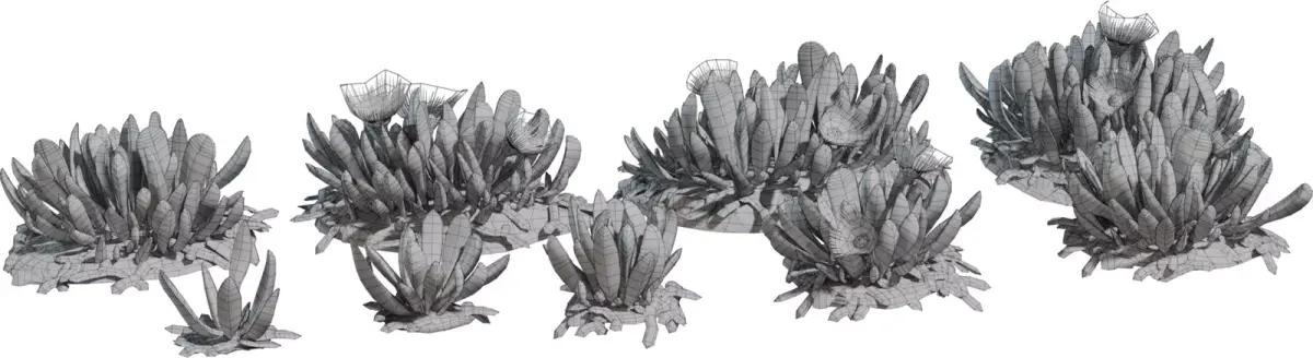 This pack includes multiple stylized succulent clumps with thick, paddle‑shaped leaves and occasional pale flower heads, ideal for arid and alien environments. Each cluster is modeled as a self‑contained ground patch with layered dead leaves and soil, so it can be dropped directly onto desert floors, rocky canyons, or sci‑fi landscapes. The meshes feature clean subdivision‑friendly topology and consistent leaf shapes that hold up in close‑up shots while still performing well in real‑time engines. PBR textures provide color, roughness, and normal detail for the fleshy leaves, dry litter, and cracked soil base, giving a convincing mix of healthy and weathered surfaces. Top‑down and side silhouettes are carefully designed, making the assets suitable for scattering, path borders, and composition focal points. This succulent clump set is a strong choice for game environments, archviz exteriors, and concept scenes that need distinctive low‑maintenance desert vegetation.