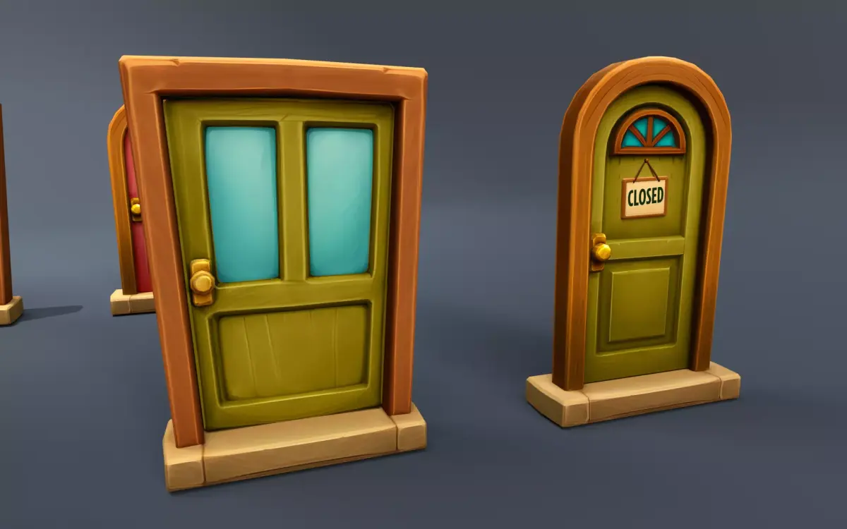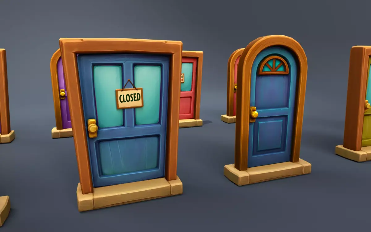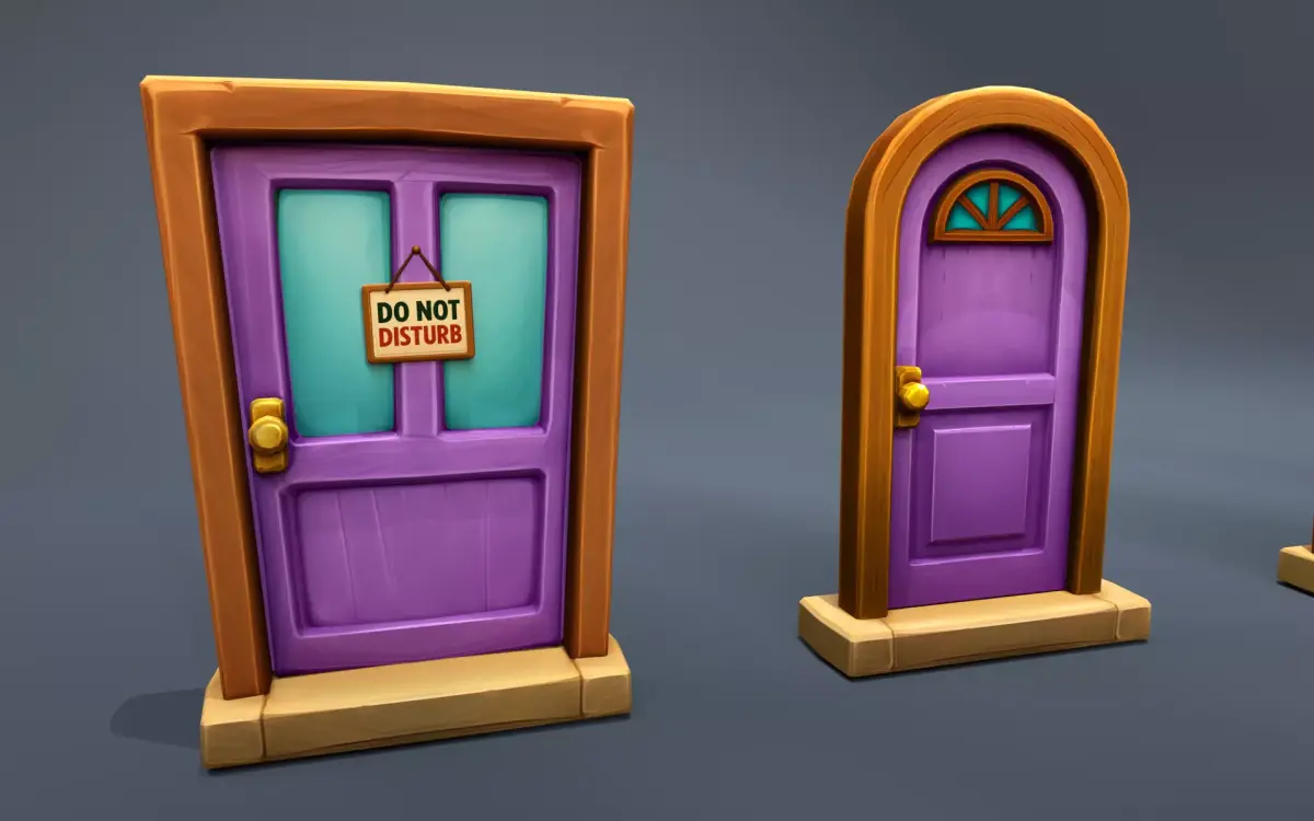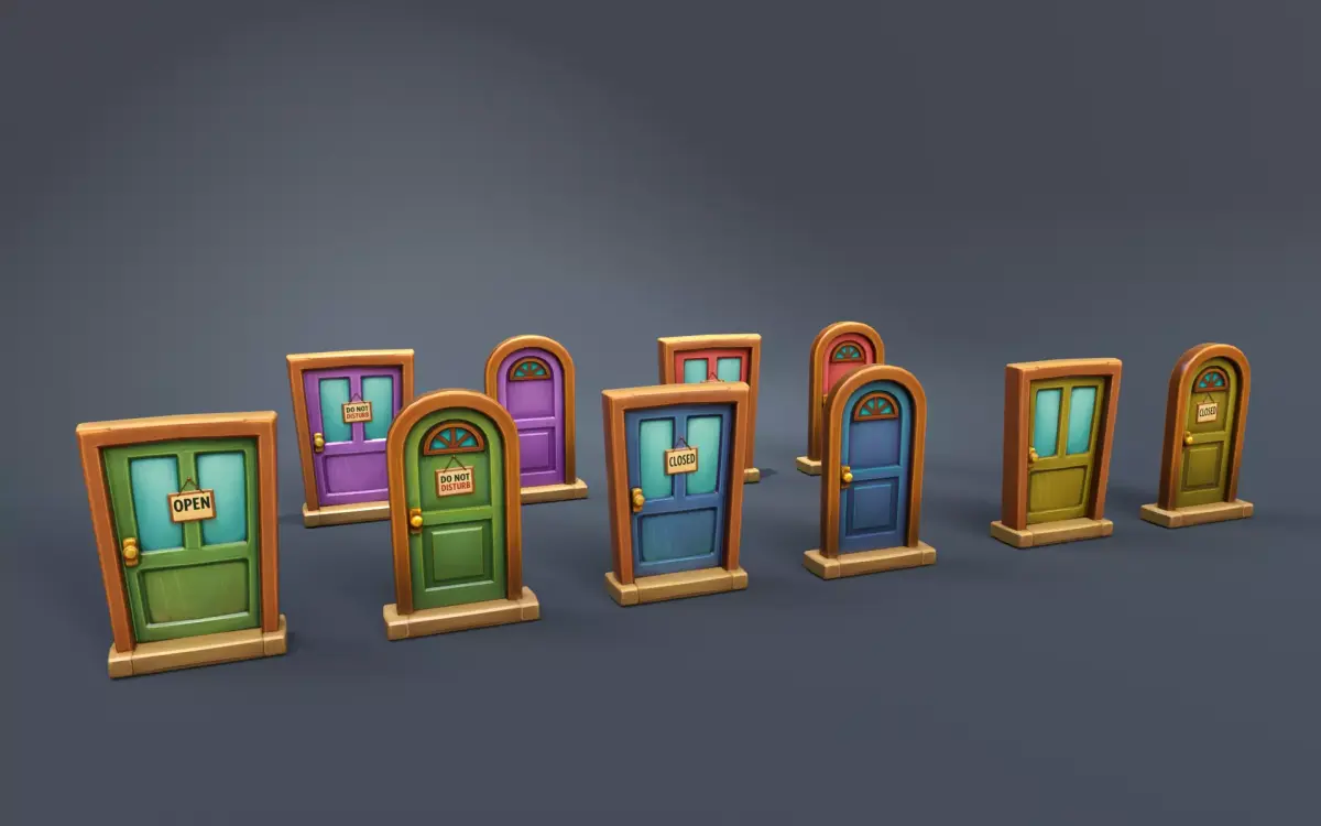 Low-poly 3D door models with **OPEN**, **DO NOT DISTURB**, and **CLOSED** signs in a stylized style.