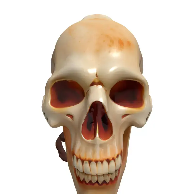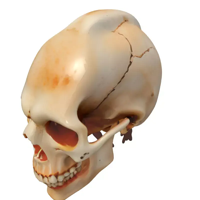 This meticulously crafted 3D model presents a distinctive stylized skull, featuring an elongated cranium that gives it an otherworldly, almost alien appearance, fused with classic human anatomical elements. A detailed, rope-like texture is intricately wrapped around the jaw area, adding a unique, macabre touch to its design. The model boasts a realistic bone texture with subtle color variations and surface cracks on the cranium, enhancing its authenticity and weathered look. This versatile asset is ideal for a wide range of creative projects, including immersive game development, creating compelling scenes for augmented reality (AR) and virtual reality (VR) applications, dynamic film and animation productions, or as a striking element in digital art compositions. It is optimized for real-time engines, ensuring smooth performance in interactive experiences, while also being perfectly suited for high-quality static renderings and detailed close-ups in architectural visualizations or cinematic projects. The model comes with clean topology, ensuring smooth deformations and easy integration into various pipelines. It is fully UV unwrapped for straightforward texture application and is designed with PBR (Physically Based Rendering) textures to deliver lifelike material representation across different lighting conditions. Supported file formats include GLB, OBJ, FBX, and USD, making it highly compatible with most 3D software and game engines.