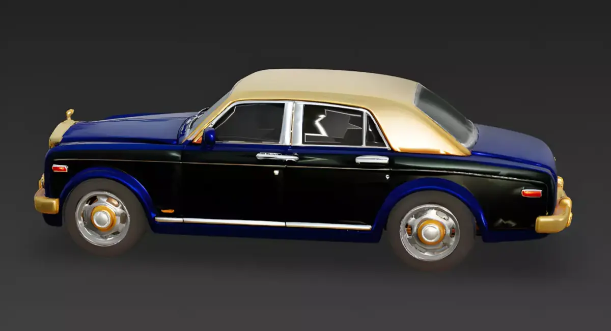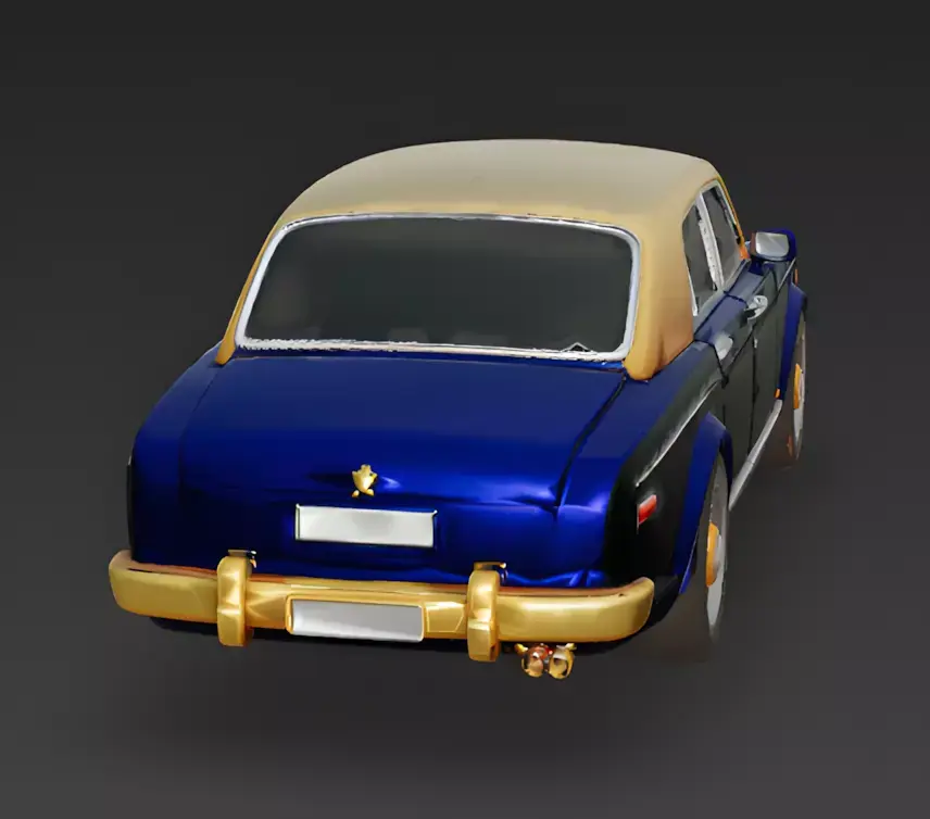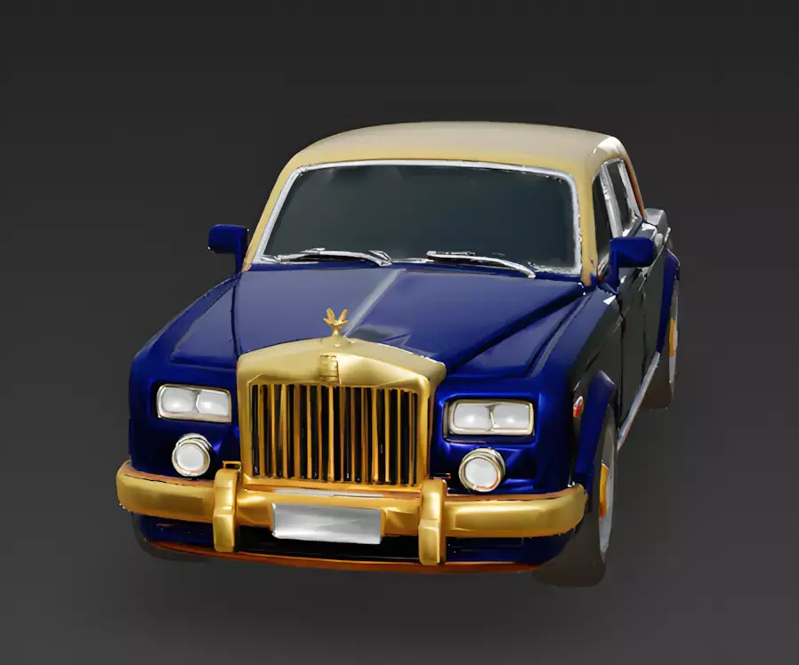 Bold Gold-Chrome AccentsThe front features an oversized, stylized gold-chrome grille and bumper. These elements, along with the hood ornament, are modeled as chunky, solid geometry to create a high-contrast, premium look that is easily readable in game engines.