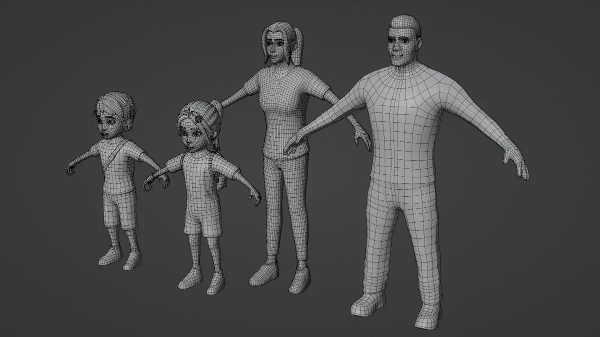 - 4 characters - boy, girl, parents100% quads, clean topology, subdivision ready
