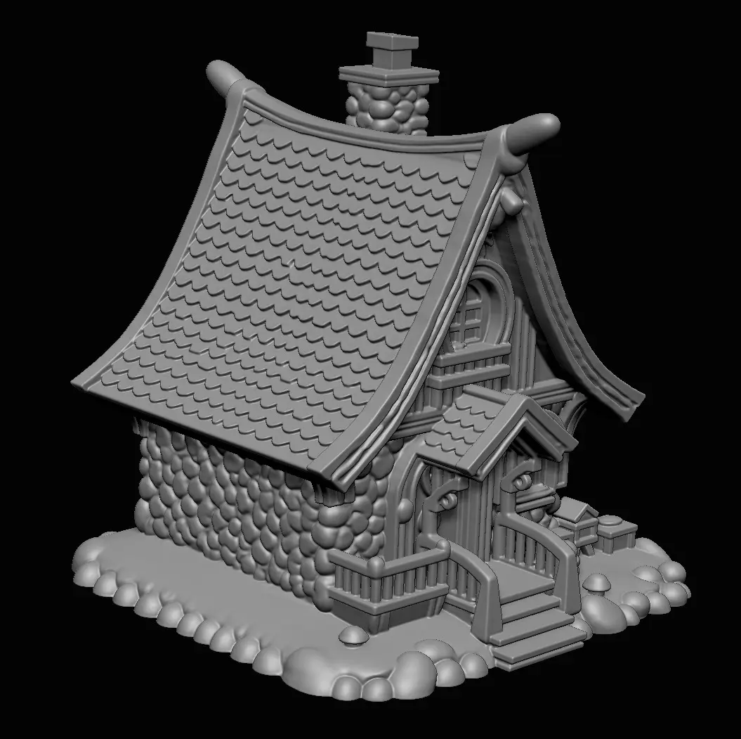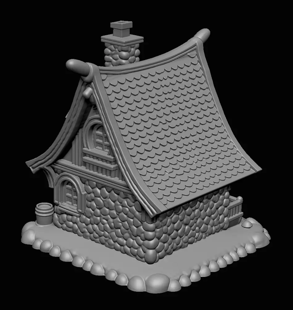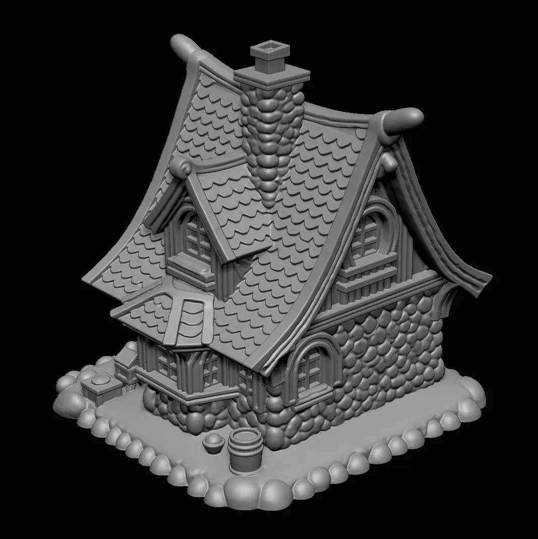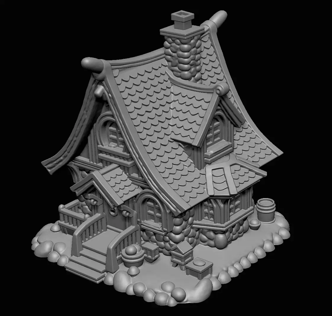 This is a highly detailed stylized fantasy cottage 3D model, perfect for use in games, animations, and 3D illustrations. Designed with a whimsical, fairytale-inspired aesthetic, the model features exaggerated roof curves, hand-crafted stonework, wooden textures, and charming architectural details.