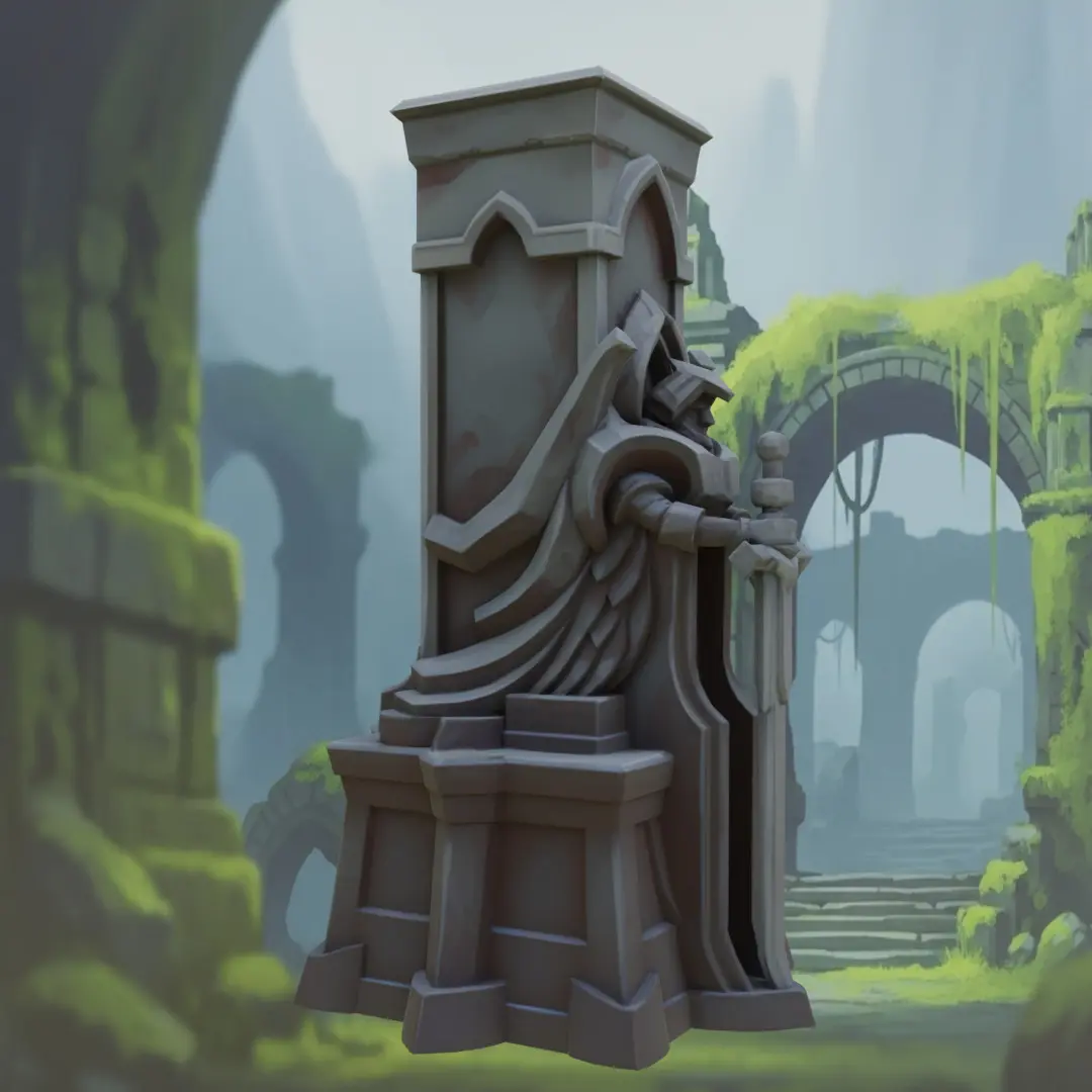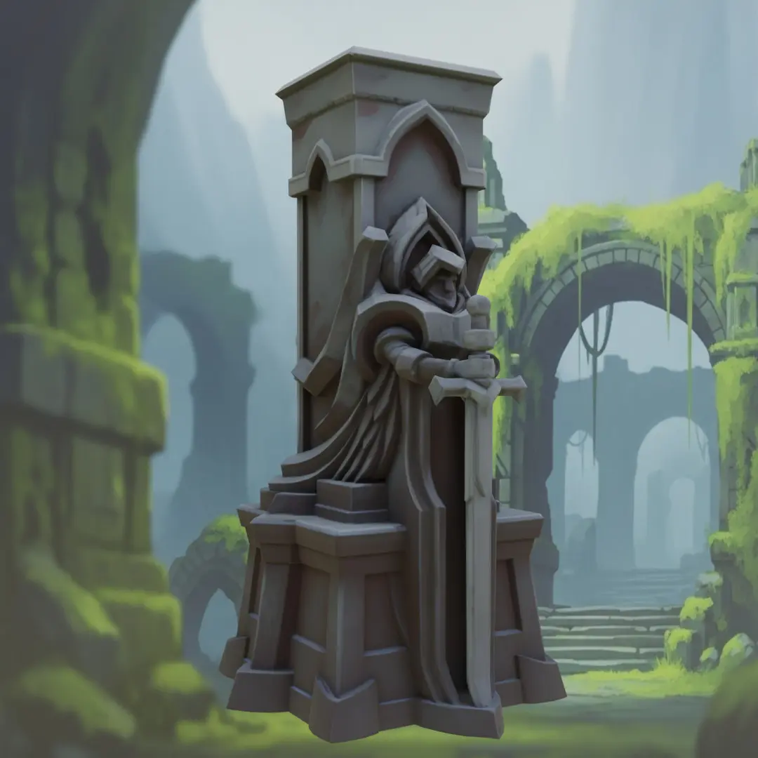 The guardian figure is depicted with a distinctive, angular design, reminiscent of chiseled stone. It features a hooded or helmed head with a minimalist, stylized face. The figure is robed, with flowing, heavy drapes that convey a sense of gravitas and permanence. Its hands are clasped firmly around the hilt of a tall, upright sword, signifying eternal watch or a solemn oath. The statue stands upon a sturdy, multi-tiered pedestal, detailed with architectural elements that enhance its monumental appearance. The model boasts a rugged, textured surface, designed to mimic ancient, moss-covered stone or worn marble, adding to its authentic and immersive fantasy feel.