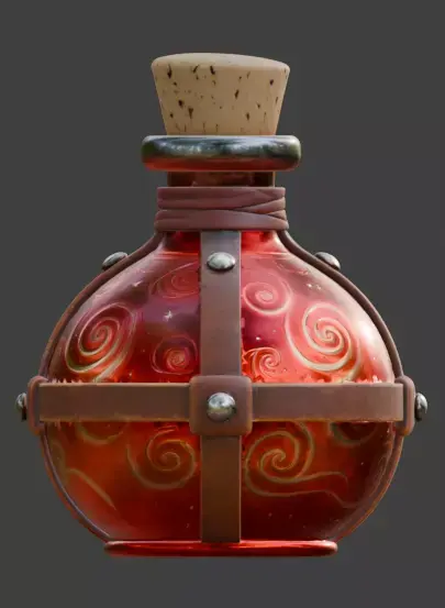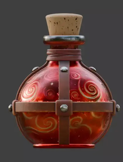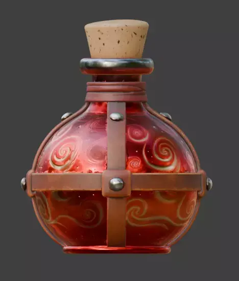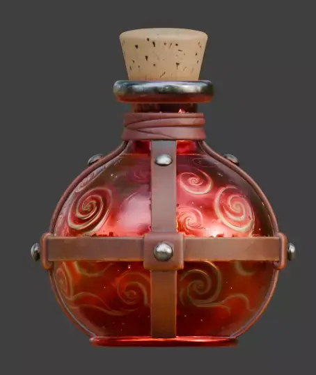 Magical Emissive Detailing: The swirling red liquid and starburst sparkles serve as a strong visual indicator for health or vitality, utilizing emissive maps for a bright, internal glow.