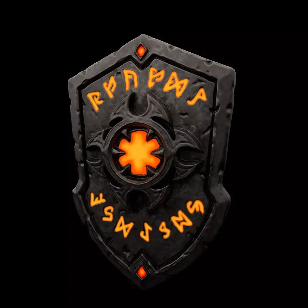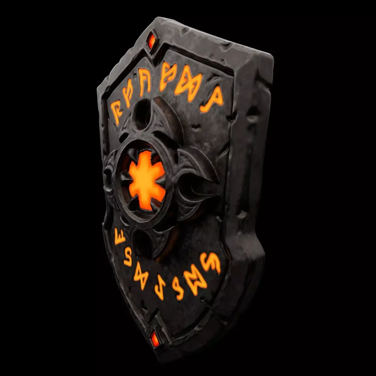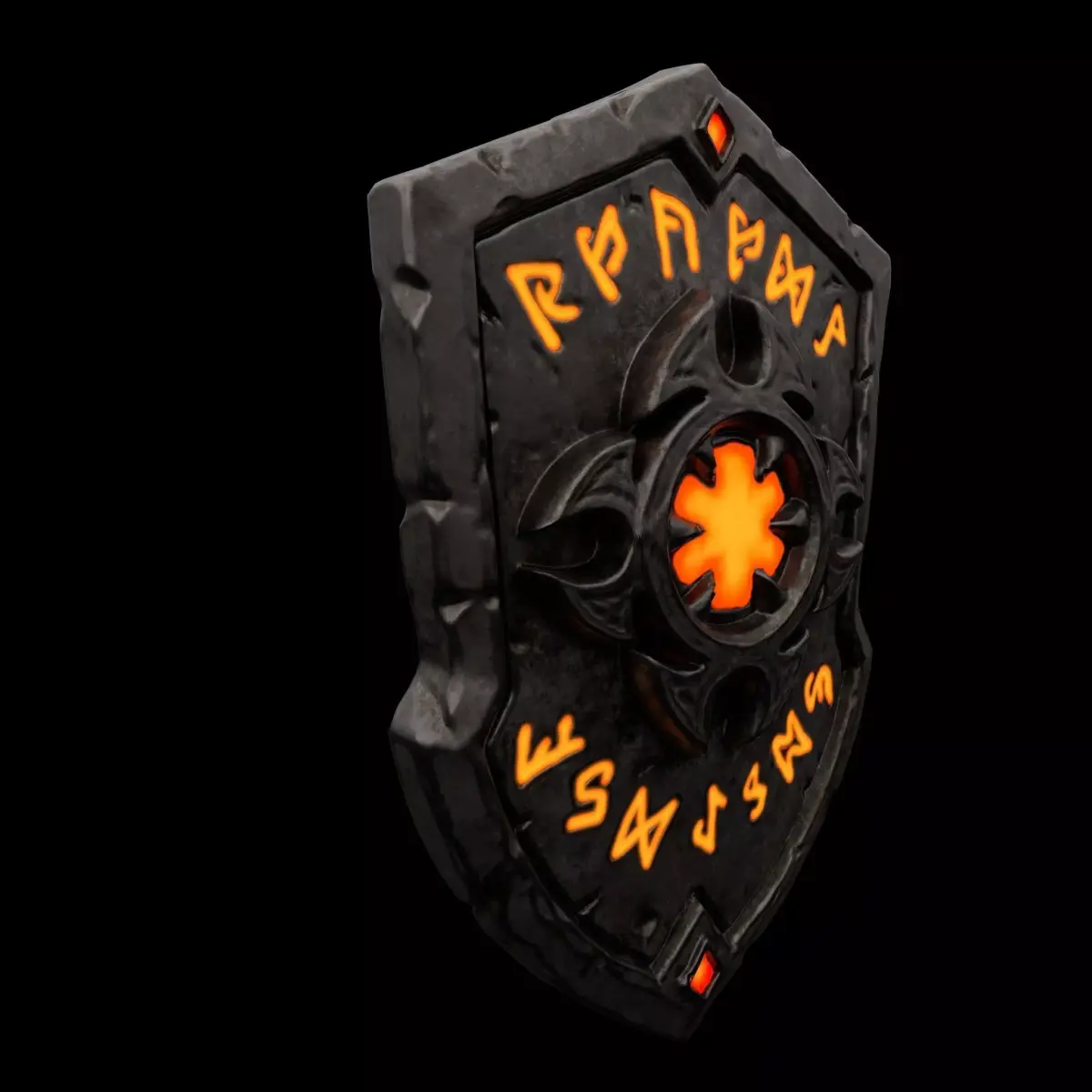 A high-quality, stylized dark fantasy shield featuring glowing ancient runes and a weathered metallic finish. This asset has been meticulously optimized from a high-poly sculpt to a low-poly mesh, making it perfect for RPGs, dungeon crawlers, or battle-centric games.
