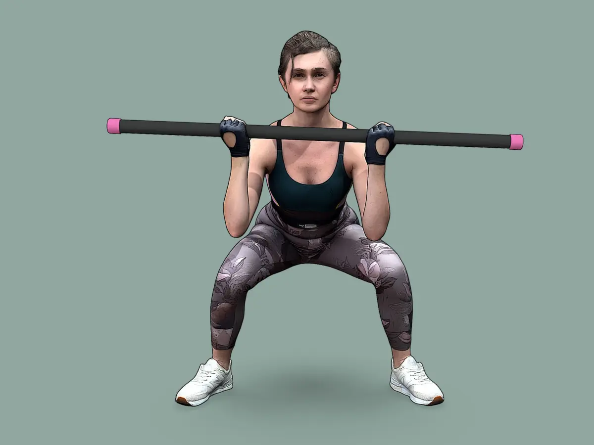 Young woman, girl in the gym, fitness, group lesson, cross fit, pumps the gluteal muscles, with a bodybar, squats.