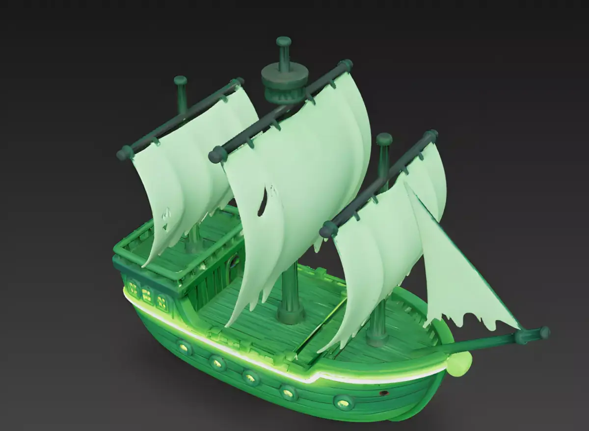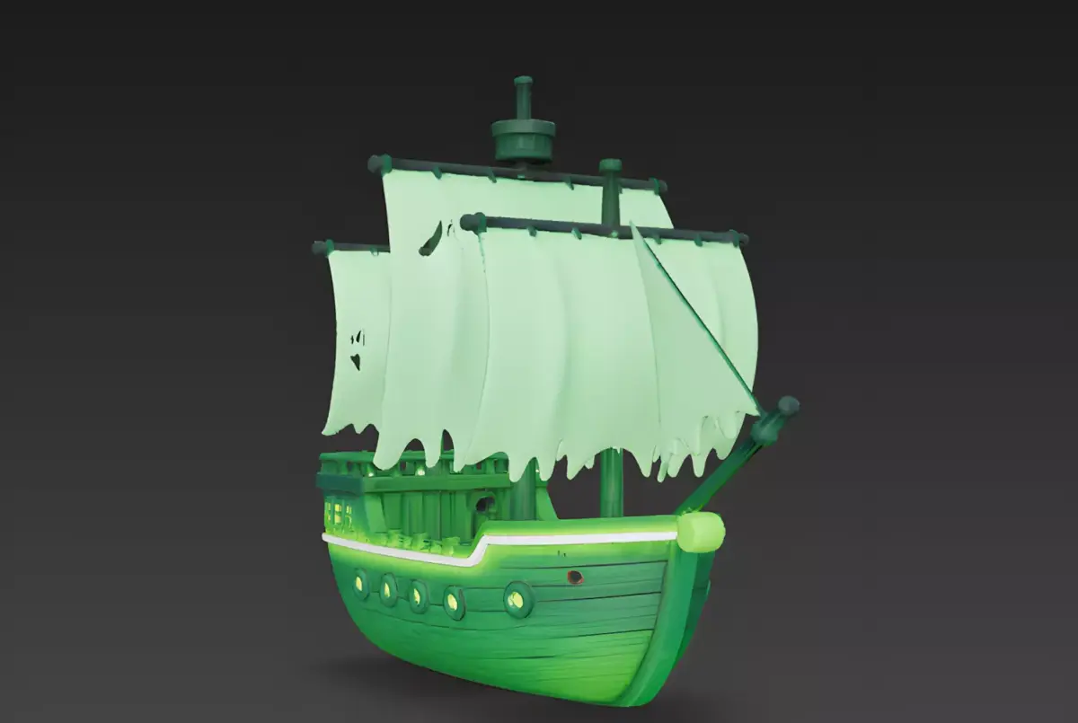 Eerie Emerald Green FinishThe ship's hull is finished in a uniform, matte emerald-green texture representing aged wooden planks infused with ghostly energy. This spectral palette emphasizes the model's smooth, organic curves and provides a professional appearance that fits perfectly within a modern cartoonish art style.