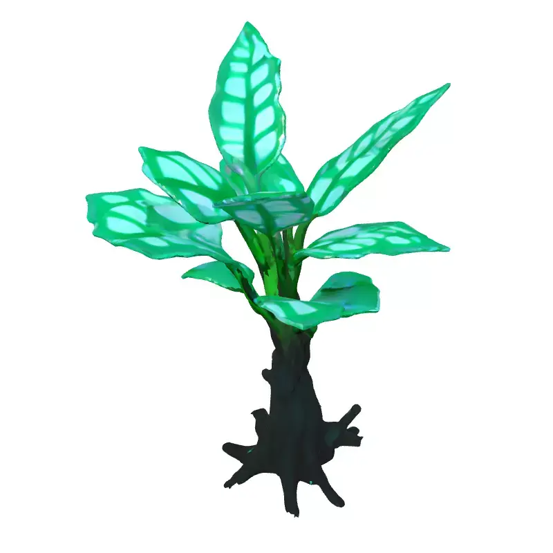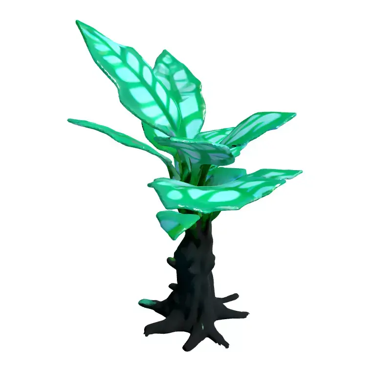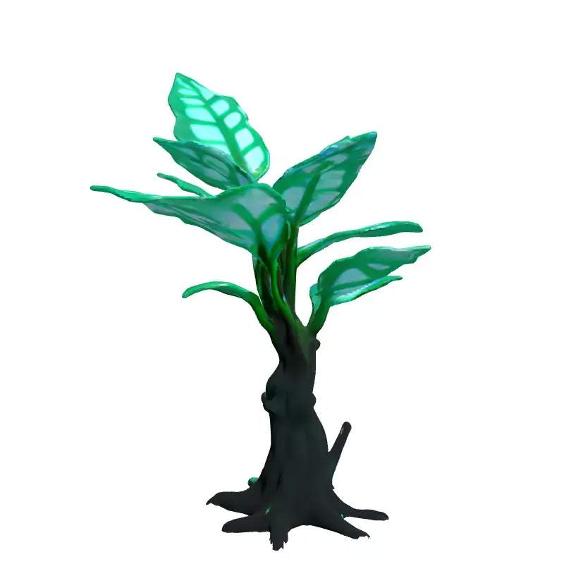 This is a unique 3D model of a stylized plant, featuring a distinct fantasy aesthetic. The model represents a vibrant sapling with a dark, gnarled trunk and visible roots, contrasting beautifully with its luminous green leaves. Each leaf is intricately designed with glowing veins, suggesting an ethereal or magical quality, making it a captivating visual element. This asset is perfectly suited for a wide range of creative projects, including game development, particularly for fantasy, sci-fi, or magical-themed environments where a mystical flora is desired. It can also enhance architectural visualizations, adding a touch of nature or a fantastical accent to both interior and exterior scenes. Furthermore, its optimized design makes it ideal for real-time applications such as augmented reality (AR) and virtual reality (VR) experiences, ensuring smooth performance and immersive interaction. Digital artists will find it invaluable for creating captivating compositions, concept art, and high-quality renders. The model is built with clean, efficient topology, allowing for easy integration into any scene and making it ready for further subdivision if higher detail is required for close-up shots. It comes fully UV unwrapped for straightforward texture application and is prepared to support PBR (Physically Based Rendering) workflows, enabling realistic material rendering of its glowing leaves and textured bark. The model supports various industry-standard file formats, including GLB, OBJ, STL, ABC, DAE, FBX, USD, and PLY, ensuring broad compatibility across different 3D software platforms. Its versatile design allows for use in both static renderings and dynamic real-time scenes, providing maximum flexibility for any project. Whether populating a magical forest or accentuating a futuristic garden, this plant model offers exceptional visual appeal and performance.