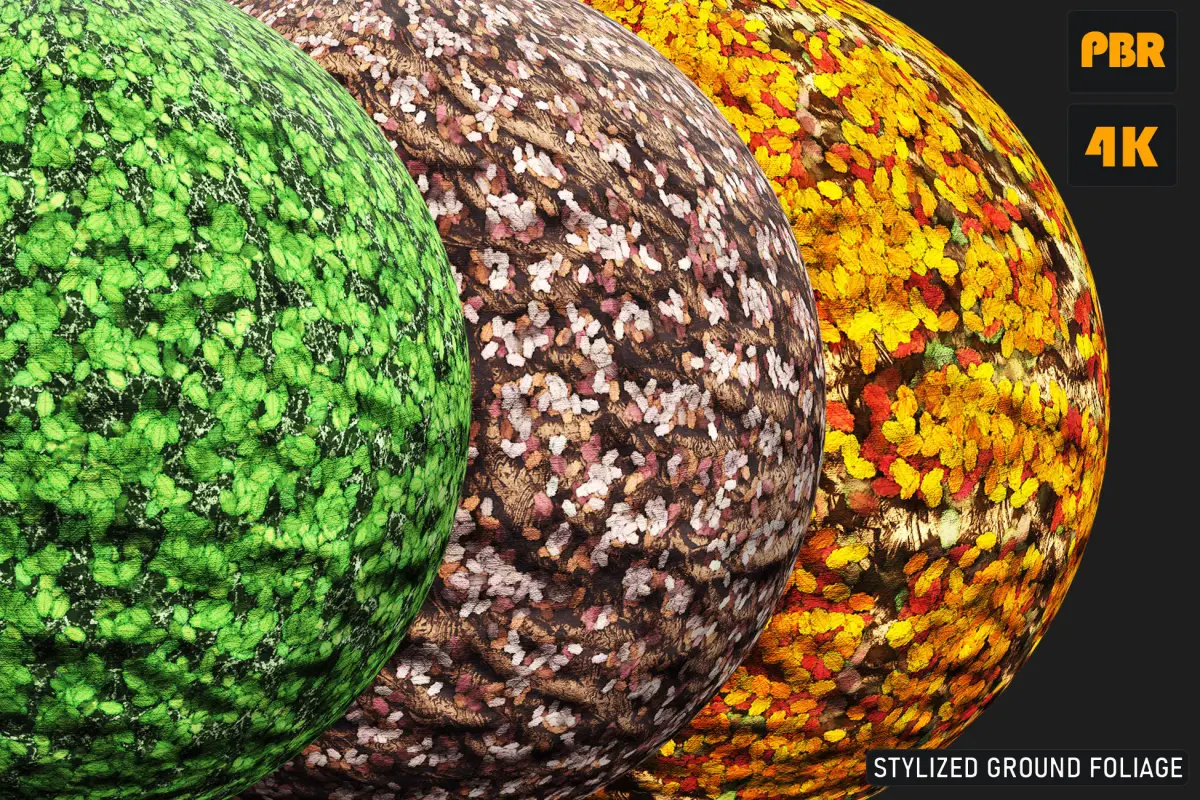 Thematic pack of materials for stylized ground foliage with 4K textures, which includes five cards in ten versions: