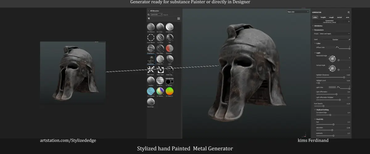 This versatile Stylized Hand-Painted Metal Generator is perfect for both Substance 3D Painter and Substance Designer users, providing a unique and customizable way to create intricate, hand-painted metal textures for your projects. Whether you are aiming for a game-ready asset or adding extra detail to your 3D renders, this generator is a must-have tool for artists focused on stylized art.
