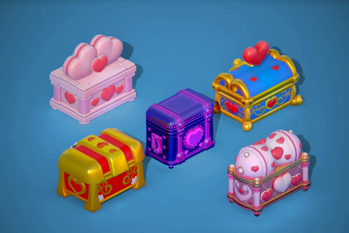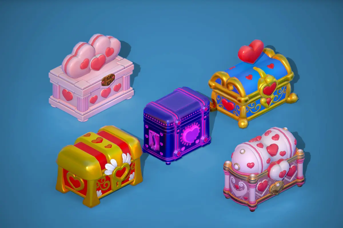 Five LowPoly stylized cute and animated Holiday or gift treasure chest for Valentine's Day. Also, the chest can be empty, it is possible to remove coins. There is an animation for opening a chest.Game-ready asset - PBR Roughness / Metalness - Accurately scaled for Unity - Mikk Tangent Space