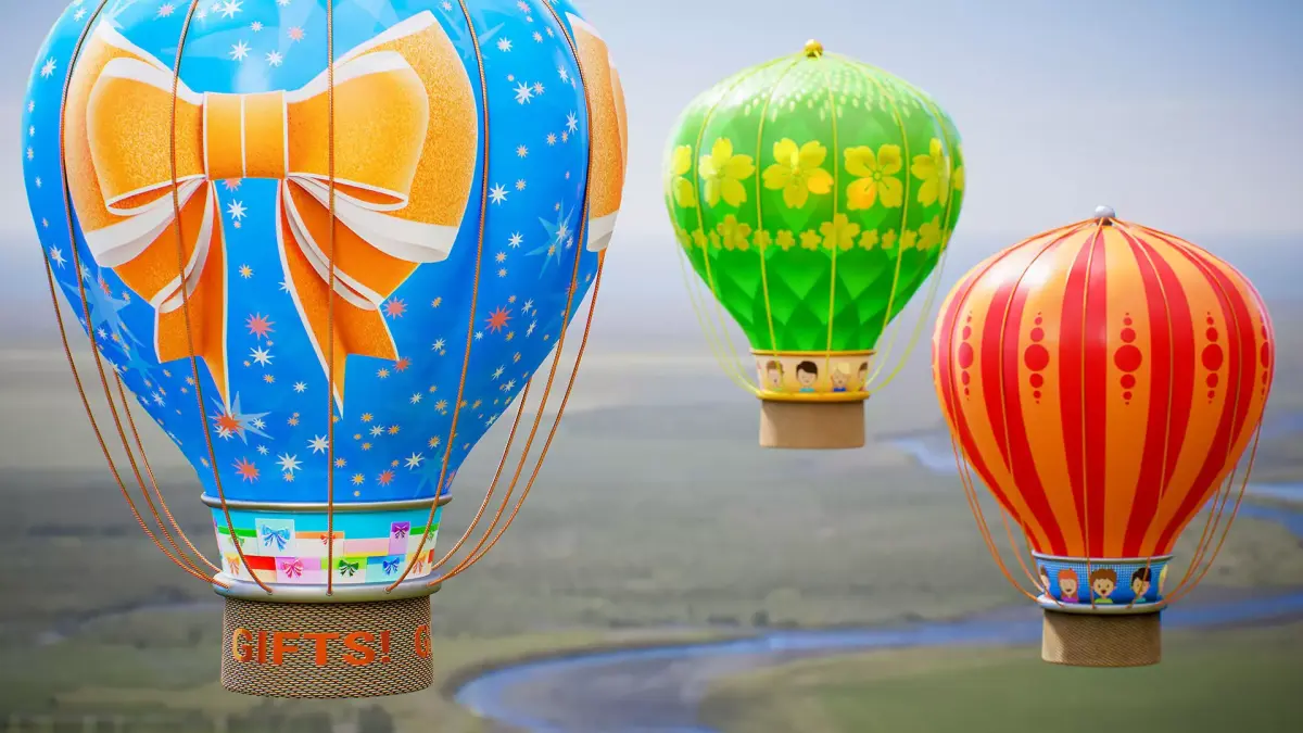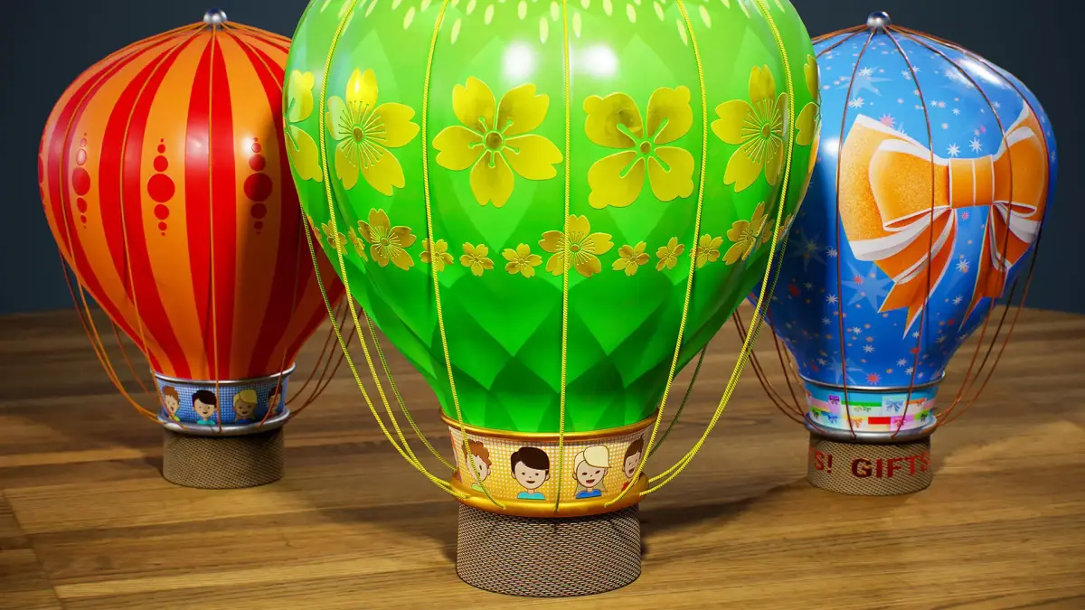 The Hot Air Balloon is available in three versions: orange-red, blue-gifts, and golden-green.