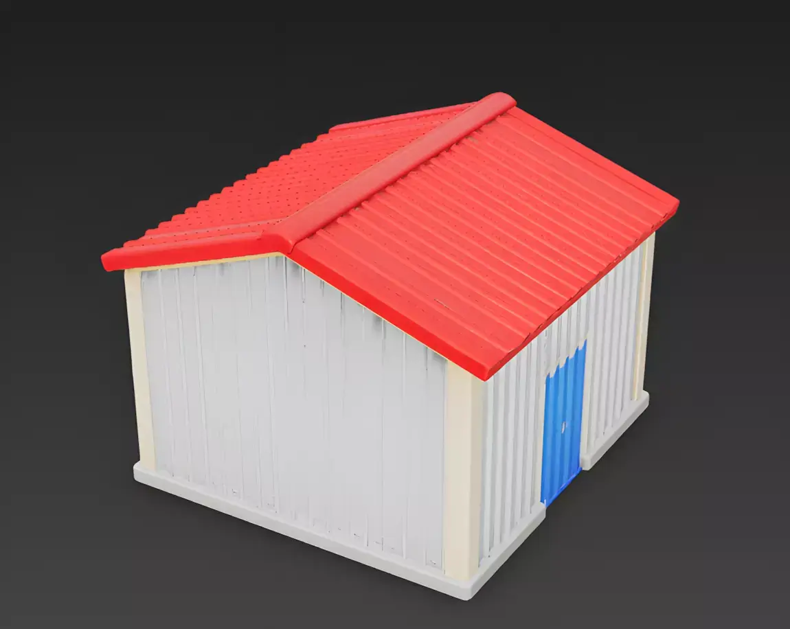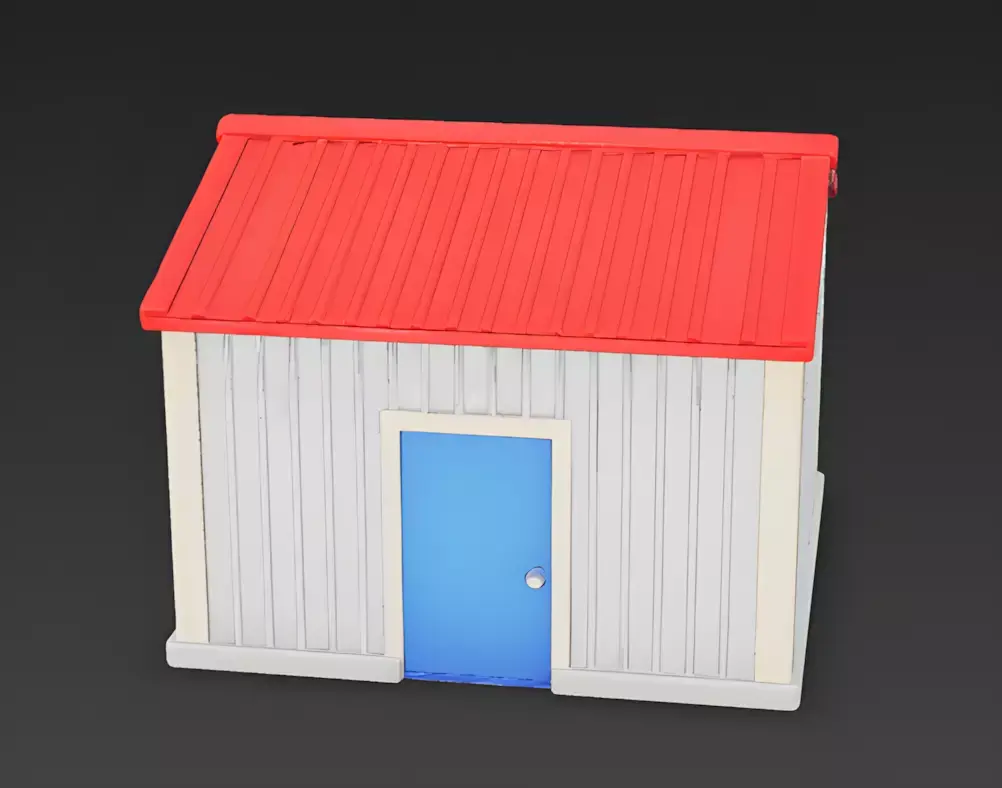 Vibrant Red Corrugated RoofThe structure is topped with a bright, saturated red corrugated gable roof. The bold color and simplified texture keep the model looking clean and illustrative, providing a high-contrast visual pop against the neutral walls.