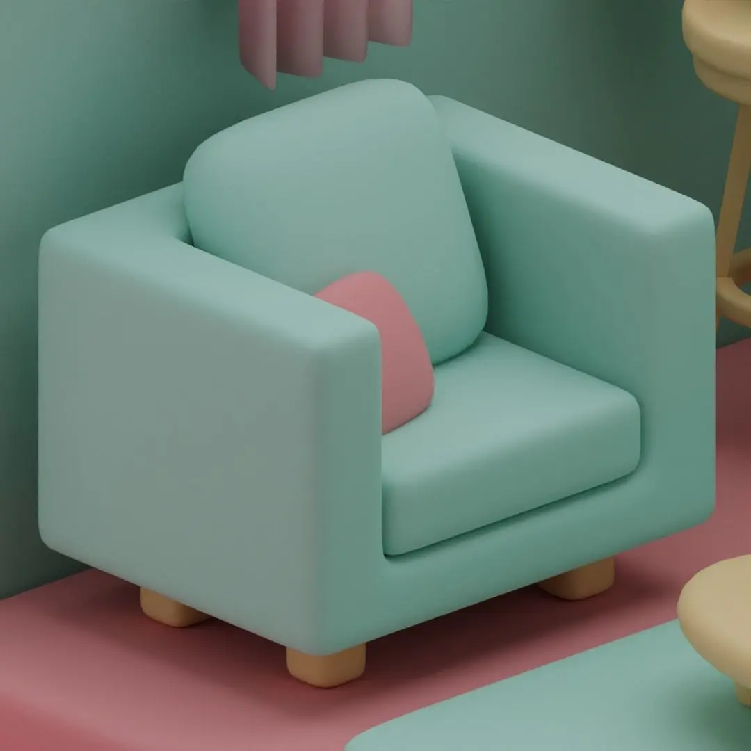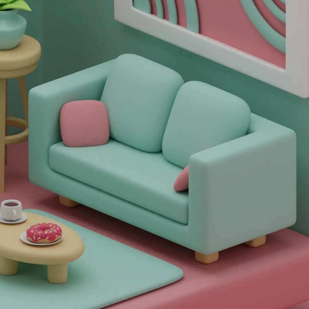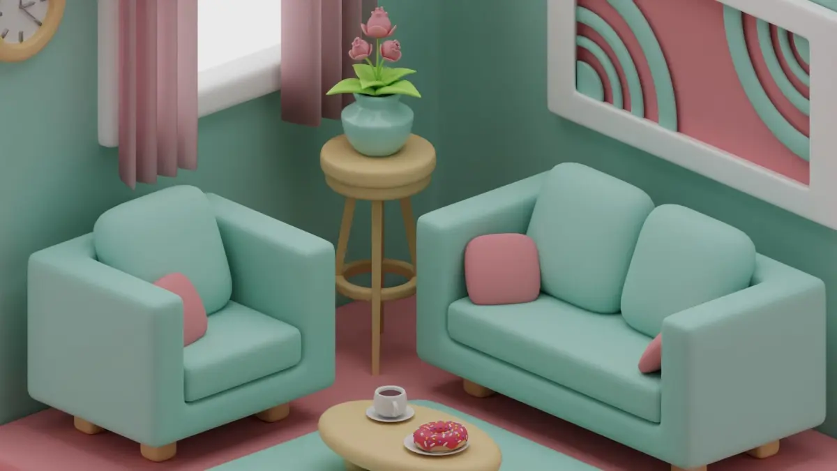 This is a Cute Stylized Isometric Living room made in blender. it consists of one longer sofa along with a smaller soda, a clock, a lamp, a plant, a coffee table with a mug of coffee and a doughnut, an abstract picture, a rug, a window and a flowering plant in a pot. This 3D Model was made in Blender 4.0.