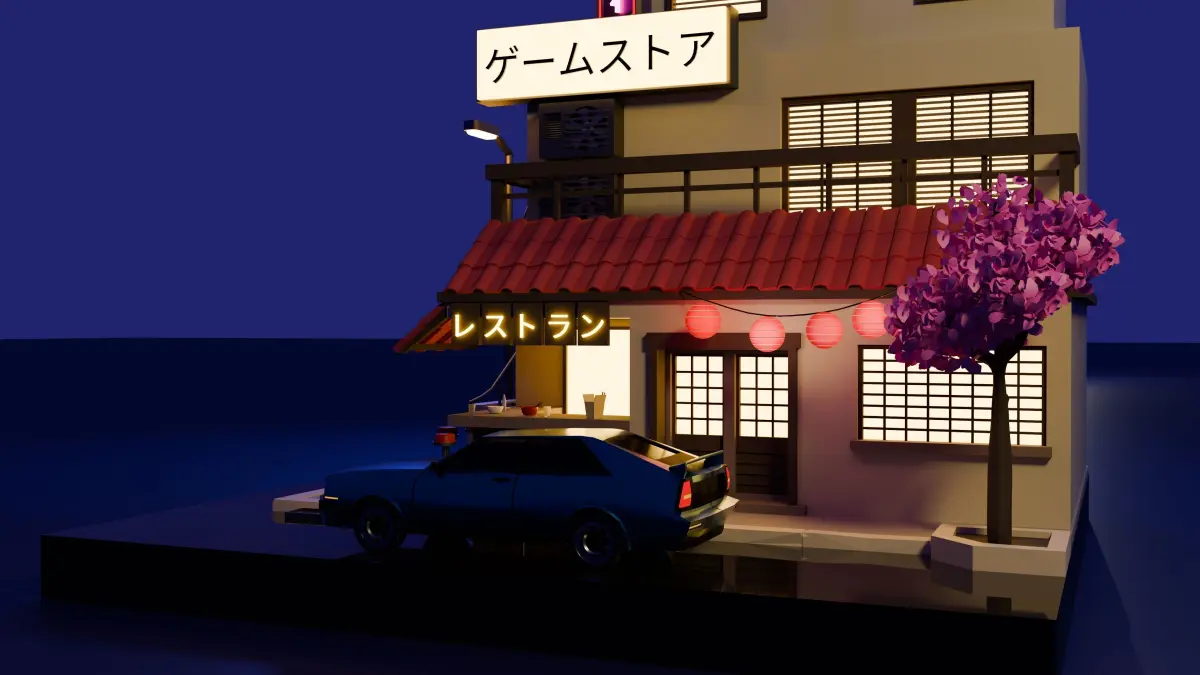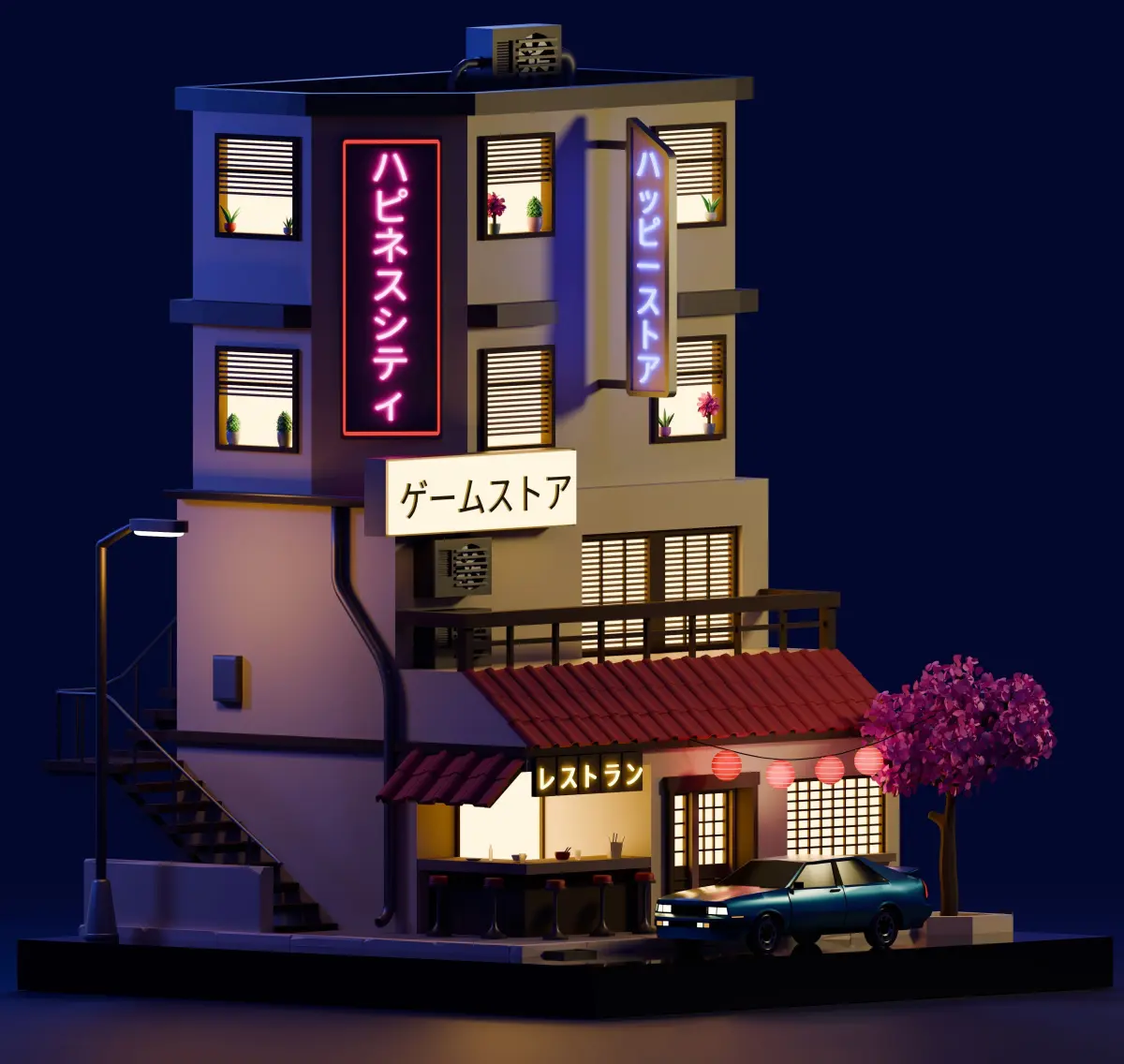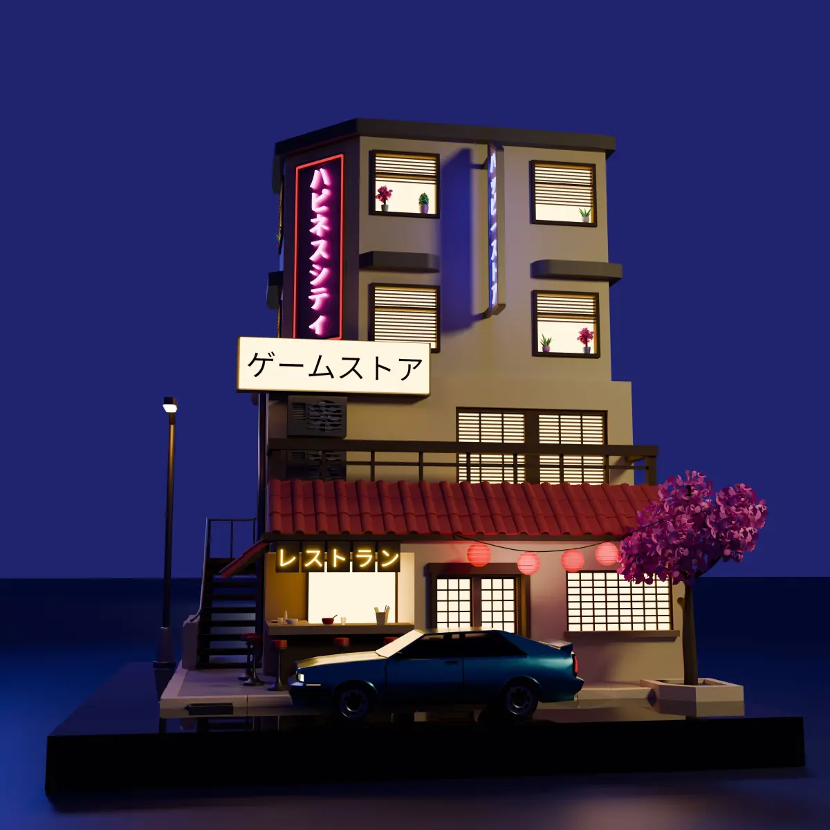 This stylized low-poly 3D model features a Japanese-style city building with four stories, vibrant neon signboards, and decorative plants along the windows. The ground floor includes a cozy restaurant storefront, while a low-poly car with metallic textures sits parked at the entrance. The street is hand-painted for a stylized and artistic look, adding charm and personality to the scene. Perfect for stylized cityscapes, game environments, or animated shorts, this asset is fully optimized for both performance and aesthetics.