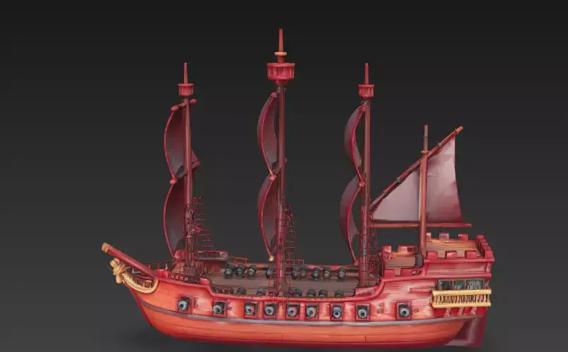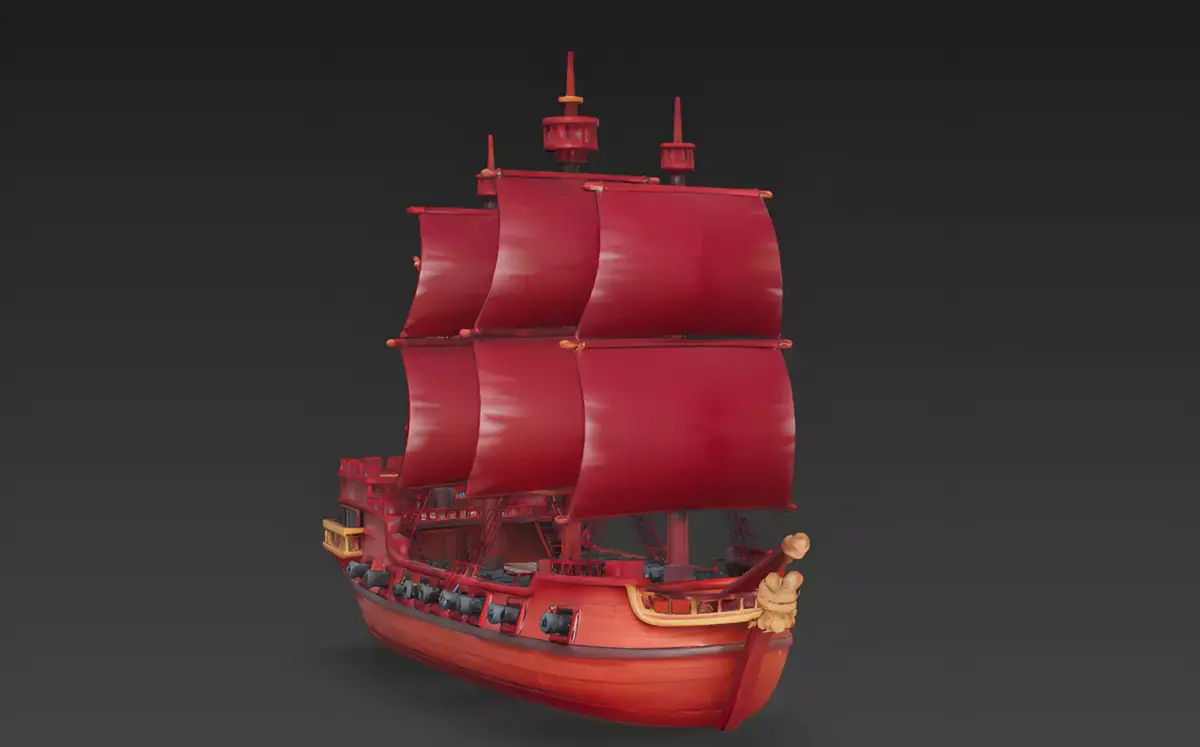 Solid Opaque Crimson SailsFollowing a specialized design language, the multi-layered square and triangular sails are modeled as thick, solid crimson surfaces. This approach strictly avoids any transparency or physics-based cloth simulations, ensuring the asset is highly optimized for performance while reinforcing its consistent, toy-like character.