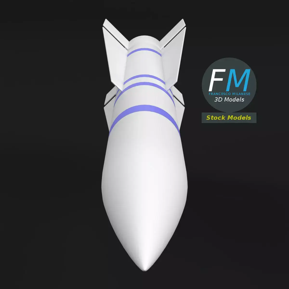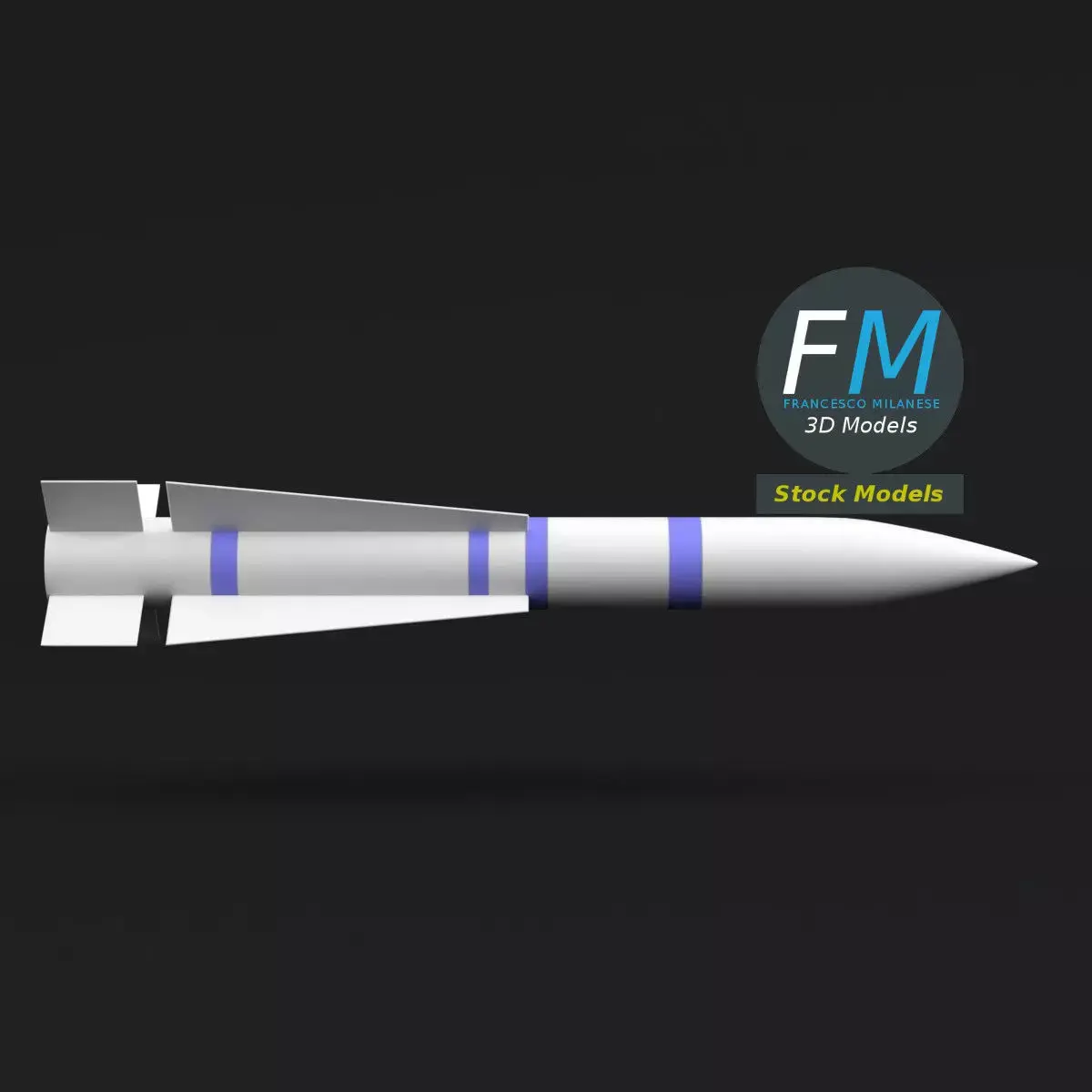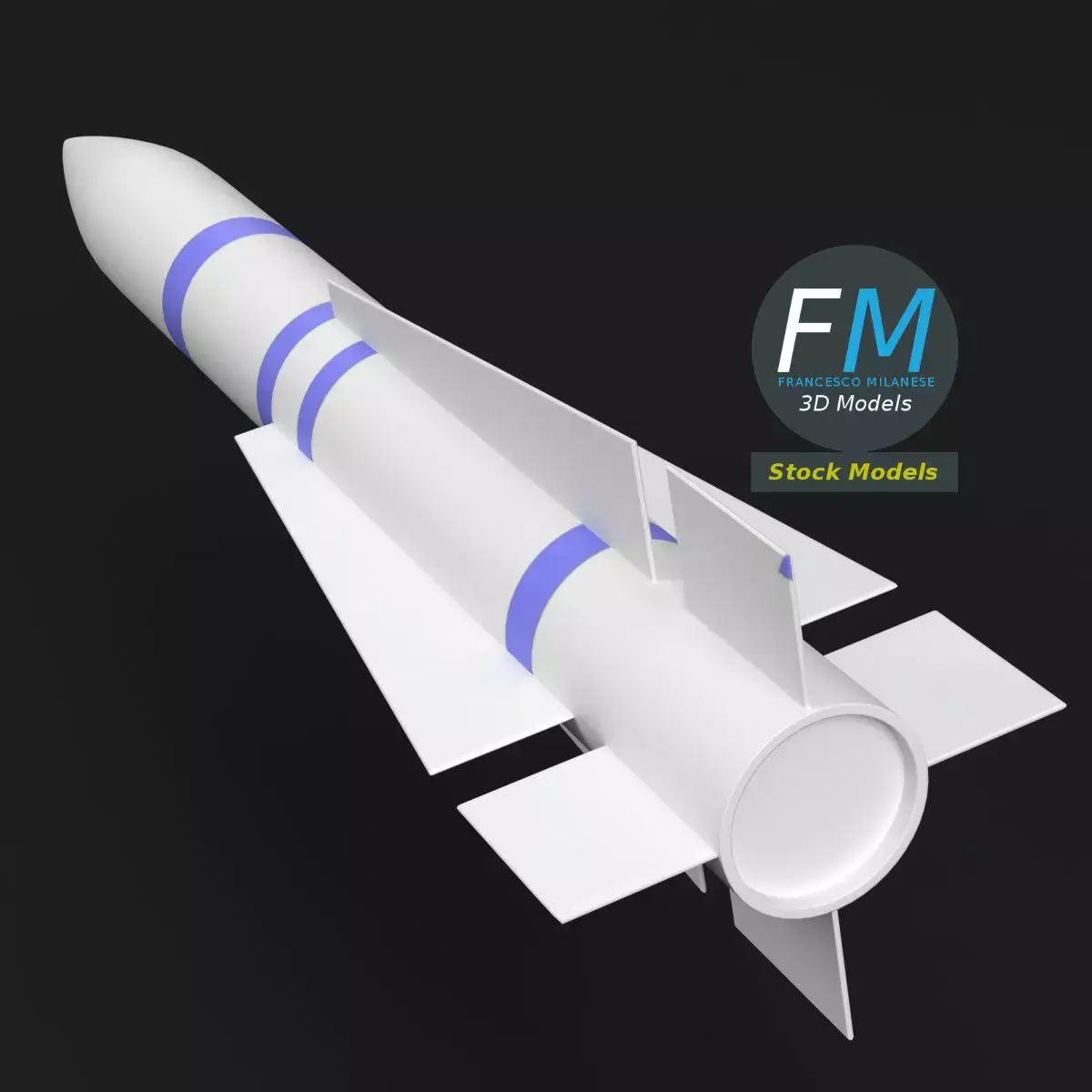 Stylized long-range air-to-air missile base mesh 3D Model featuring blue training identification bands. Clean topology and lightweight geometry make it ideal for real-time applications, simulations, and concept scenes. 1 Object, 1 Material with non overlapping UV Layout Map and PBR Textures set. Production-ready 3D Model with non overlapping UV Layout map provided in the package. PBR Materials and Textures (Metallic Workflow: Base Color, Metallic, Roughness, Normal) embedded in the Blend, FBX, and GLB files.Easily customizable: UV unwrapped geometries; UV Layout maps provided in the package as png with alpha images.Quads-only geometry.Made with Blender 5 with Cycles Principled BSDF (PBR, Metallic Workflow) Material, then exported to other formats (OBJ, FBX, GLB; FBX and GLB have embedded textures).Promo images: some renderings made with Cycles for Blender, plus Wireframes and Blender screenshots (Object Mode, Edit Mode with UVs).Formats included: FBX with embedded PBR Textures (Metallic Workflow: Base Color, Metallic, Roughness, Normal), GLB with embedded PBR Textures (Metallic Workflow: Base Color, Metallic, Roughness, Normal), OBJ; scenes: BLEND (with Cycles Principled (PBR) Materials); other: 16-bit PNGs with Alpha.1 Object (mesh), 1 PBR Material, UV unwrapped (non overlapping UV Layout map provided in the package).UV Layout maps and Image Textures resolutions: 2048x2048.Polygonal, QUADS-ONLY, 6106 vertices, 6096 quad faces (12192 tris).Real world dimensions; scene scale units: METERS in Blender 5 (that is: Metric with 1.00 scale).Uniform scale object (scale applied in Blender 5).PBR Textues included: in a zipped folder, you'll find the PBR Textures set (as 16-bit PNGs with Alpha).IMPORTANT --- Main renderings made with Blender 5 + Cycles using an HDR Environment Texture Image which is NOT provided in the package!