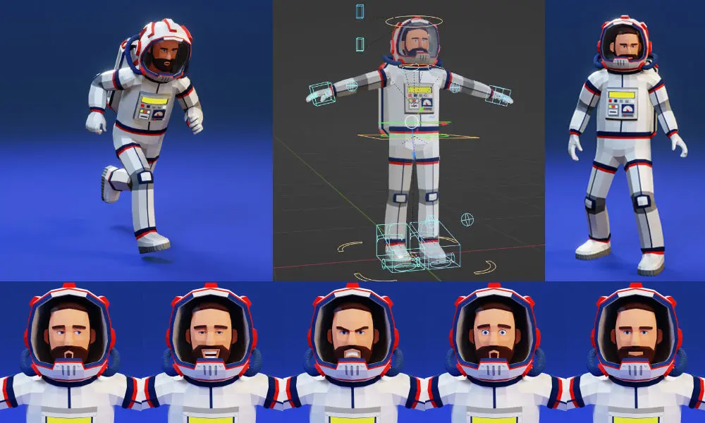 The low-poly stylized astronaut was made in Blender 3D and features a great rig with facial animation controlled by just two bones. Five animations are included as examples for this low-poly astronaut in a spacesuit, but you can easily create any other poses and animations for this character.