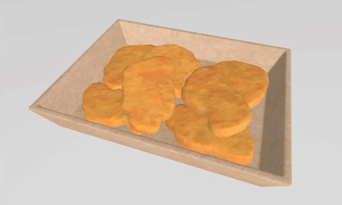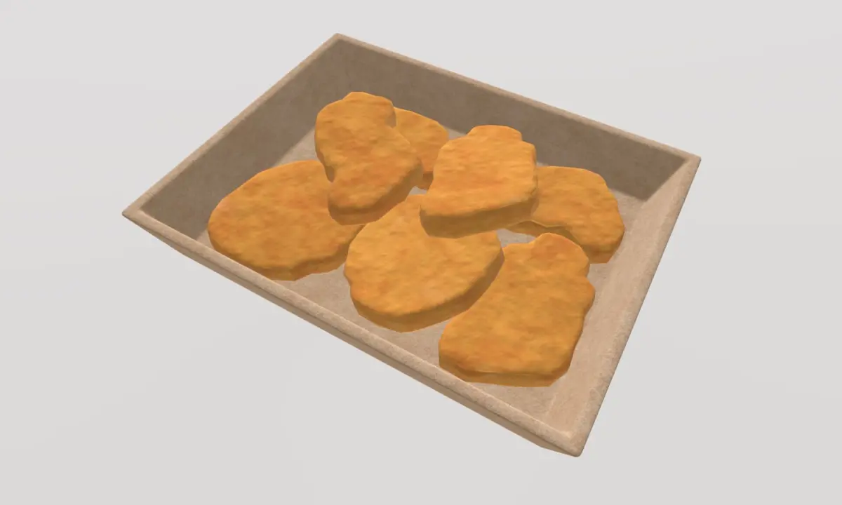 Introducing the Chicken Nuggets - Fast Food Series, a detailed 3D asset perfect for your gaming, animation, or virtual projects. These golden-brown nuggets are crafted to bring realism and charm to any scene, complete with a cardboard tray for an authentic fast-food presentation.