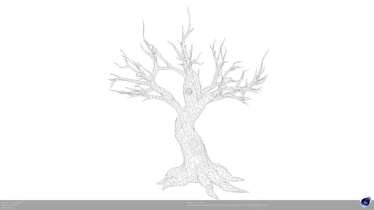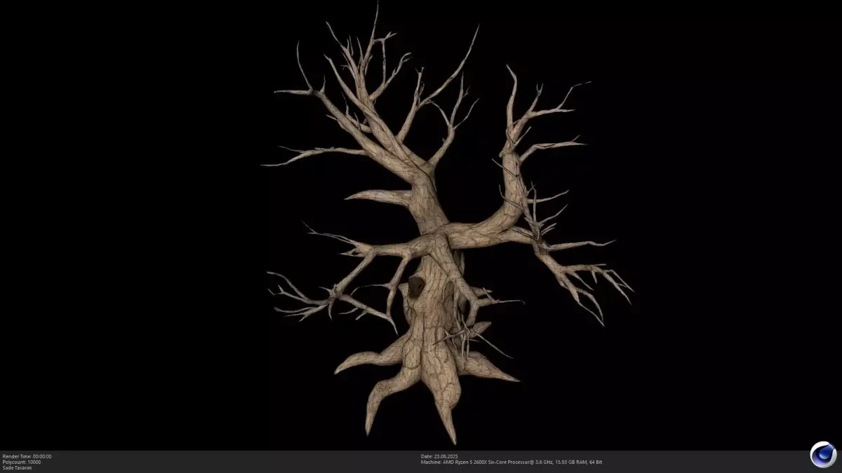 A stylized, low-polygon 3D model of a bare, twisted tree, perfect for video games, animations, or fantasy environments. The model features a unique, handcrafted look with a gnarled trunk and spiky roots, bringing a touch of whimsy and character to your scenes.