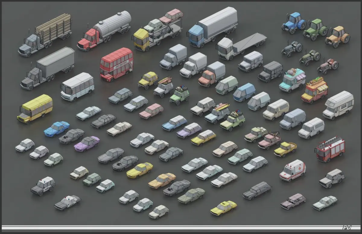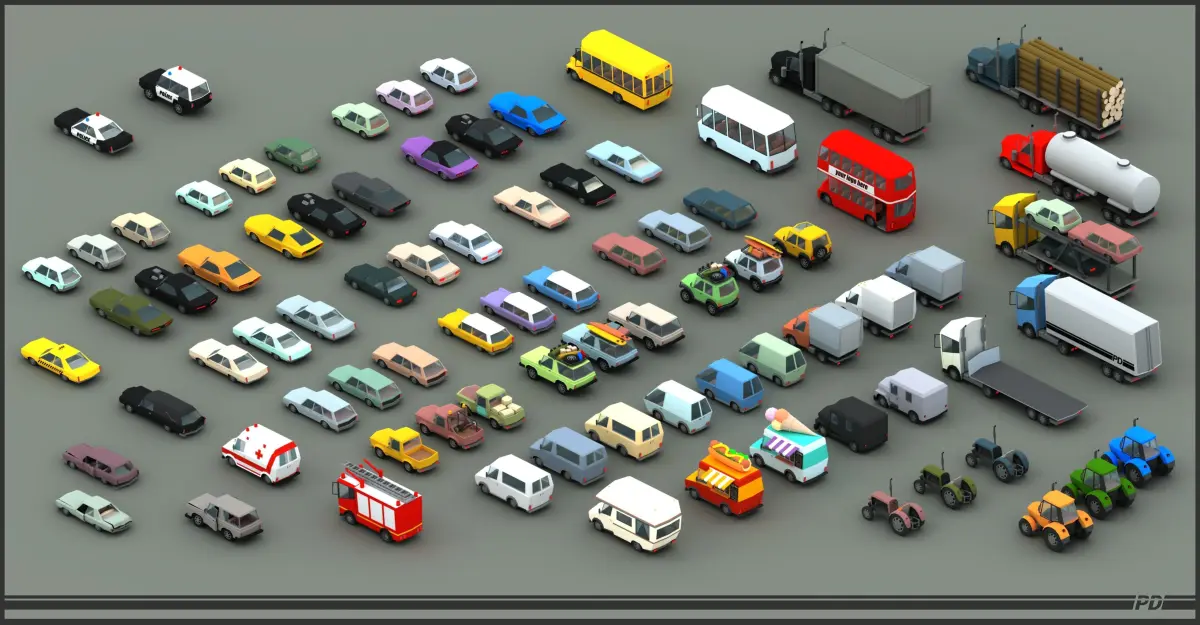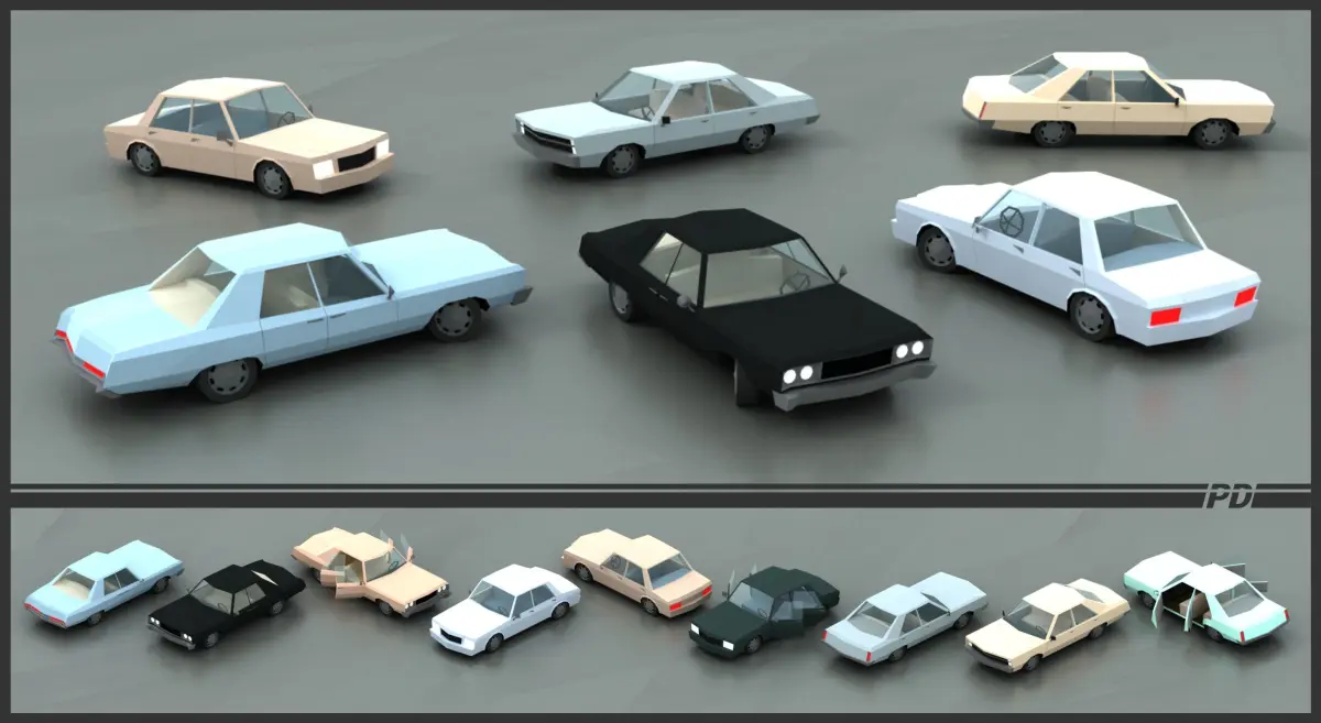 This pack contains 53 different cars and 89 different color variations.Simple interior, separate wheels, separate door. There is a separate material for the body color, so you can easily change it.All models share the same material and texture, atlas, for optimum performance on mobile devices.1024x1024 texture maps - diffuse, roughness, metallic, emissionIncluded formats: 3ds, OBJ and FBX