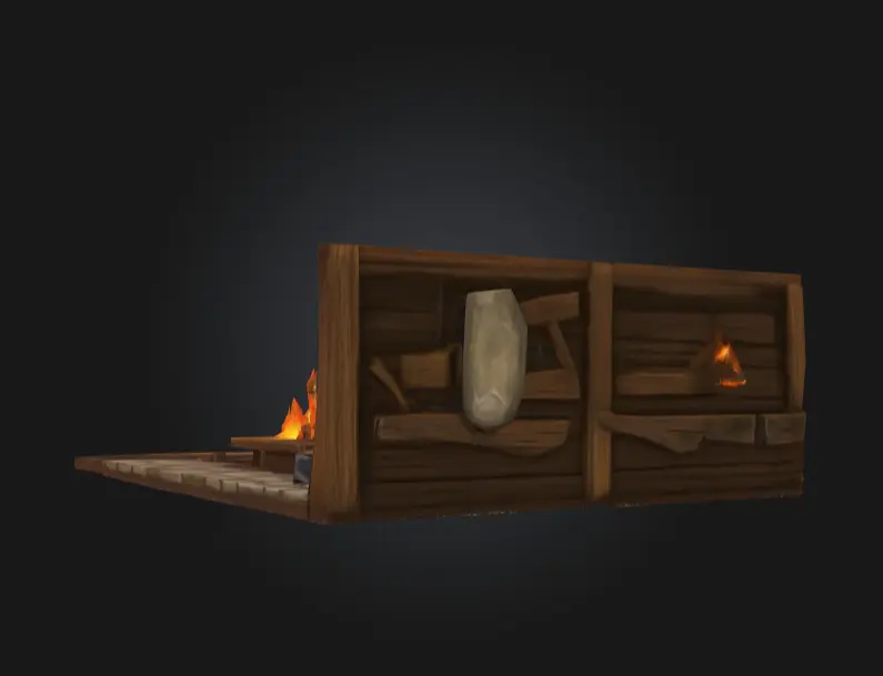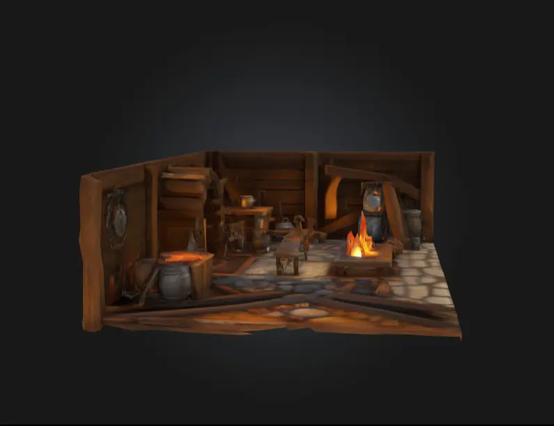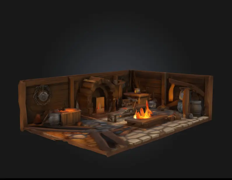 A fully detailed, stylized medieval blacksmith workshop 3D model, perfect for fantasy RPGs, open-world games, and cinematic environments. This asset includes an immersive forge setup with anvil, bellows, tools, molten metal furnace, wooden barrels, hanging lanterns, and stone + timber structures. Crafted in a hand-painted, stylized art style ideal for Unity, Unreal Engine, Blender, and mobile platforms. Optimized for game development with clean topology and PBR-ready textures. Perfect for fantasy towns, NPC hubs, or crafting zones in RPGs and adventure games.
