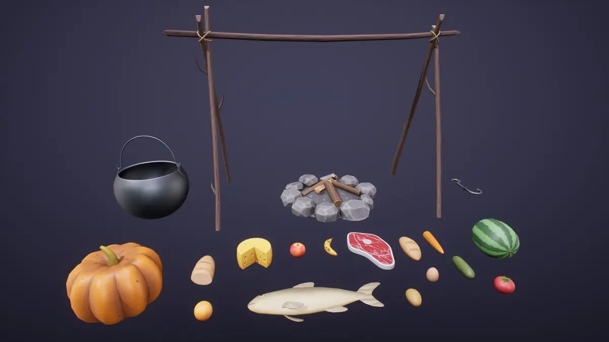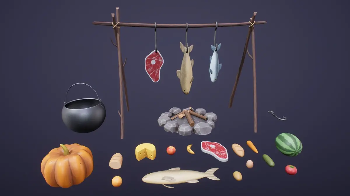 A collection of 15 Stylized Medieval Foods, Including Campfire, Cooking Pot and More with Stylized PBR Textures. Suitable for any scene. Ready to use in any project.
