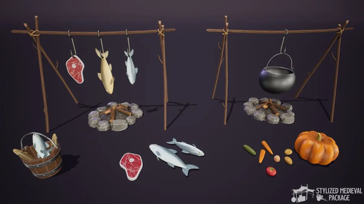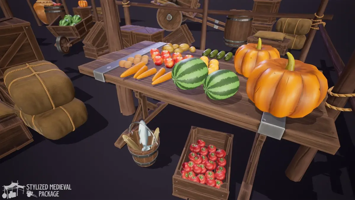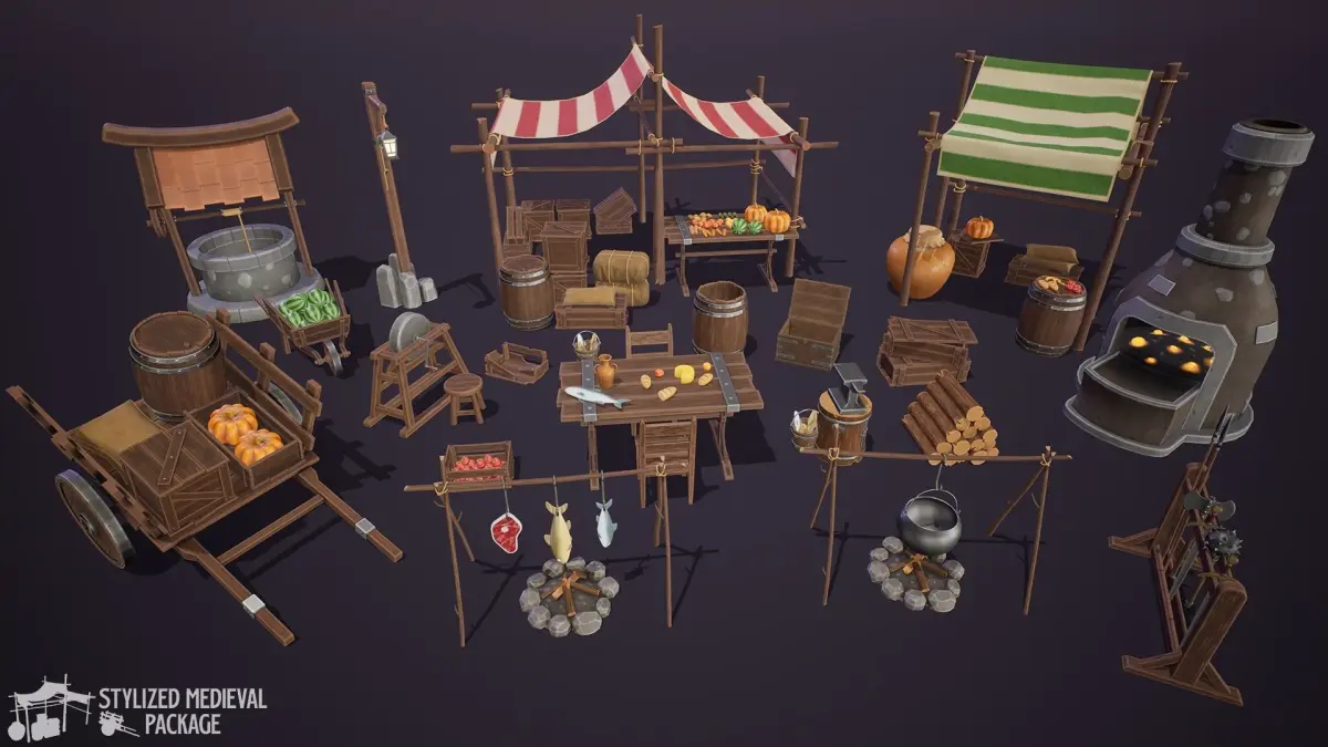 On this Stylized Package you will find more than 50 Medieval Props, including: Market Stalls, Blacksmith Tools, Boxes, Foods, Weapons and more. All to give a new look in your medieval scene!