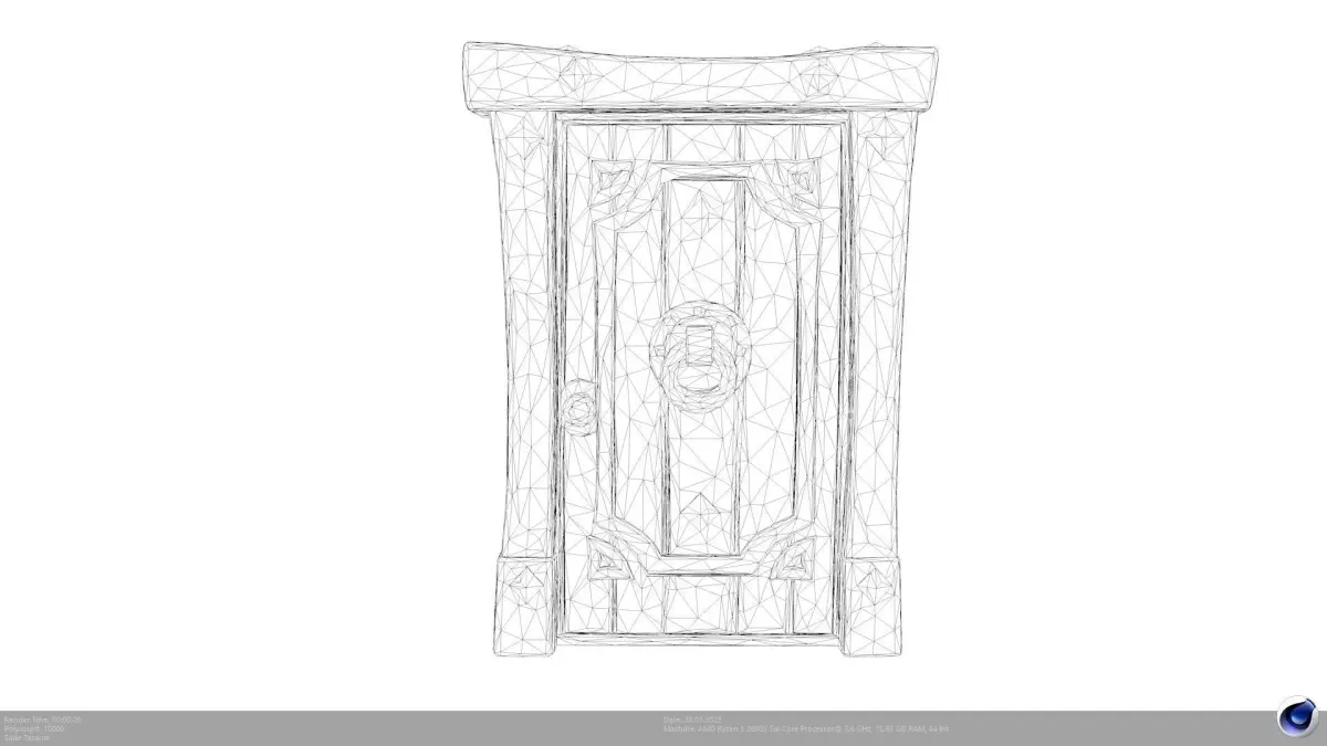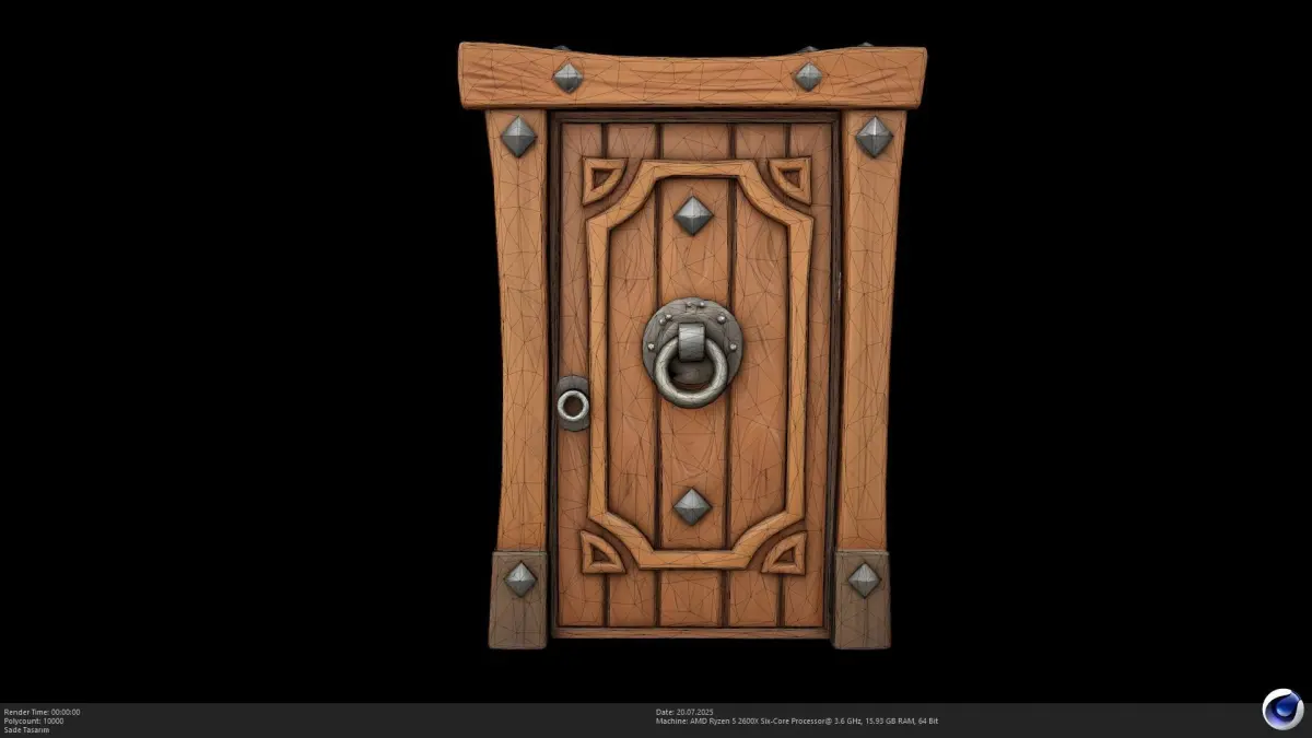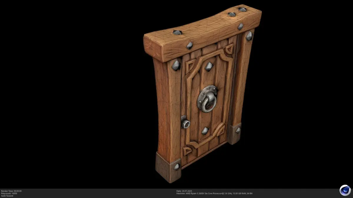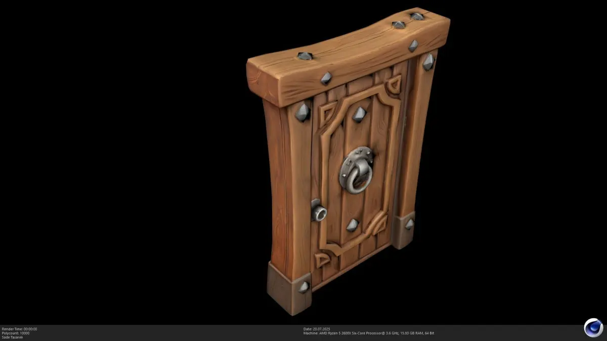 The model showcases a robust wooden door with distinct planks, reinforced by decorative metal studs and a prominent circular door knocker. The hand-painted aesthetic gives it a warm, inviting, yet durable appearance, fitting seamlessly into various stylized settings. Its versatile design makes it an excellent prop for creating immersive architectural details and setting the mood for your digital scenes.